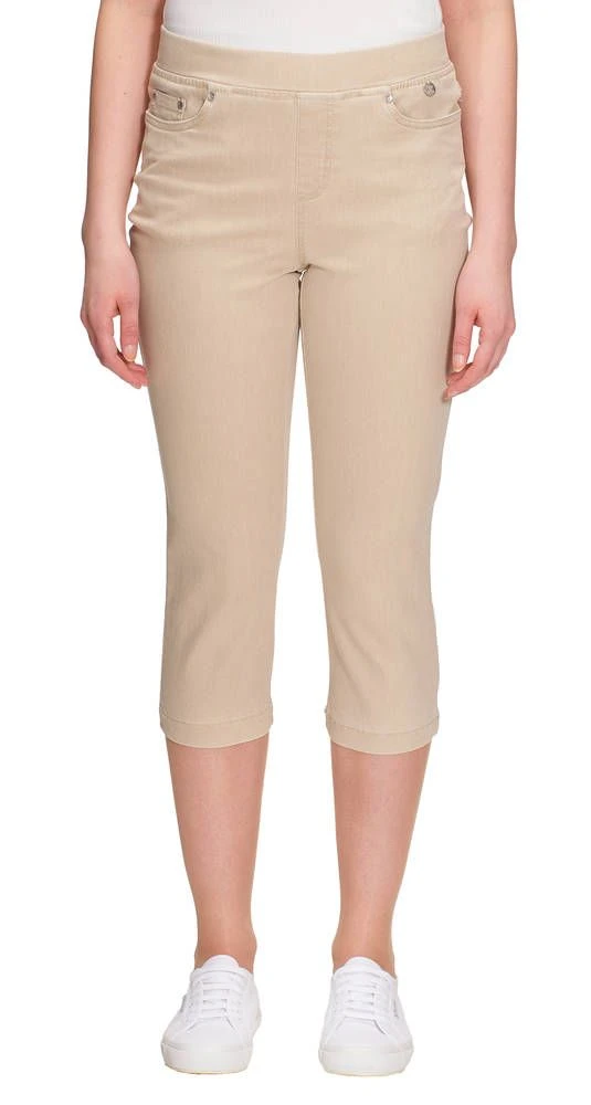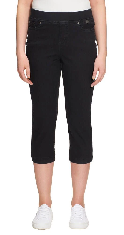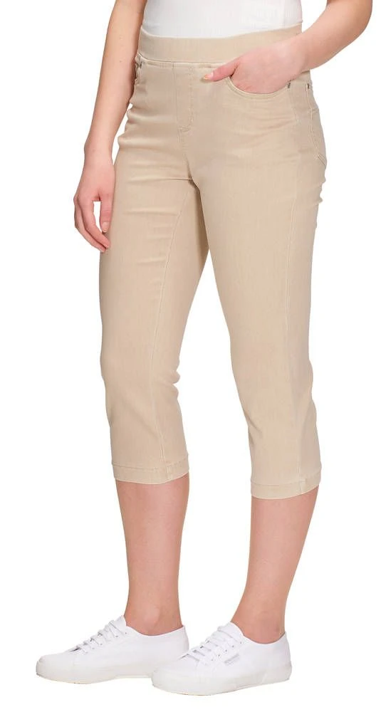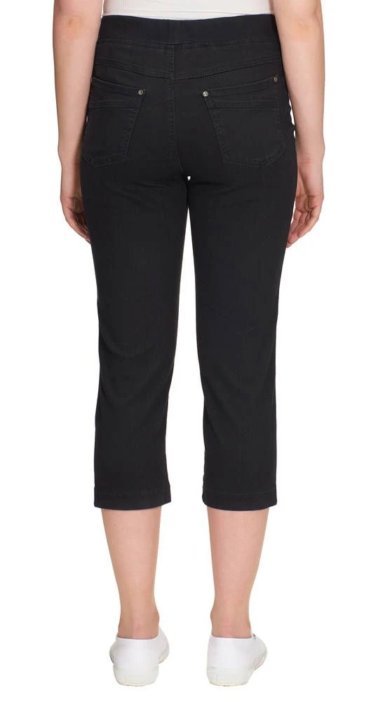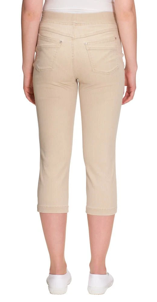Joustavat ja pehmeät kuminauhavyötäröiset caprit farkkumaisella materiaalilla. Housujen etupuolella on kaksi avotaskua ja takana paikkataskut. Malli käyttää kokoa 36. Mallin mitat: vyötärönympärys 63 cm ja pituus 174 cm.