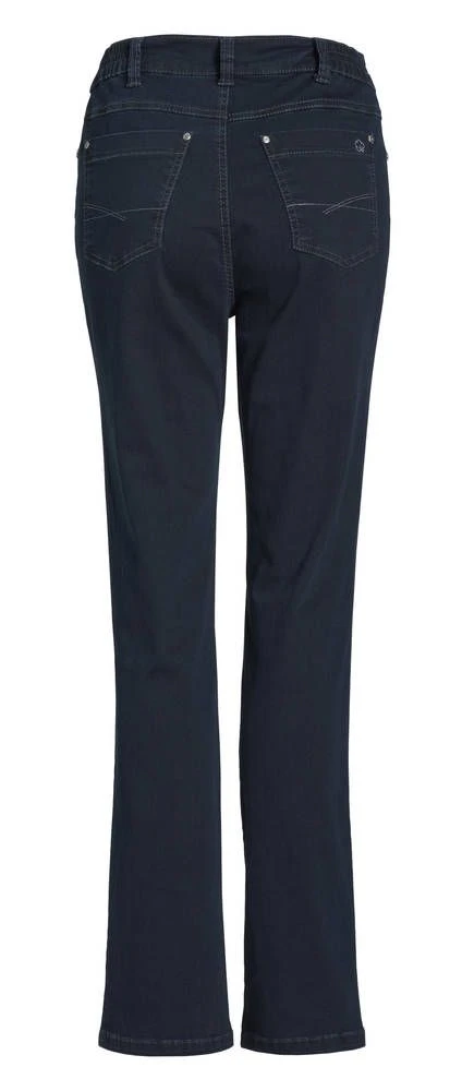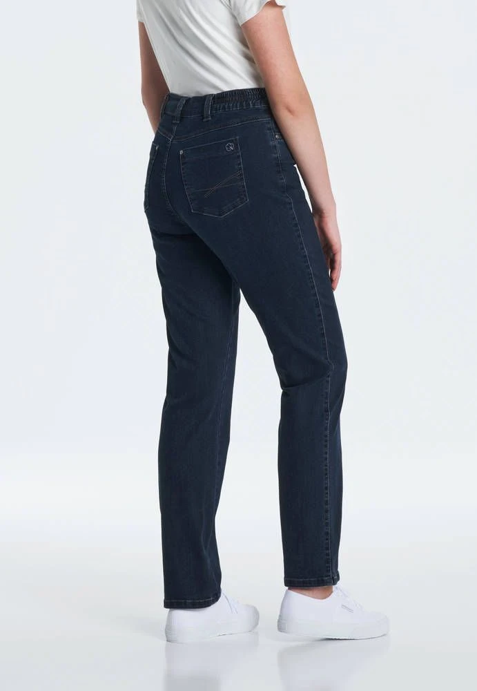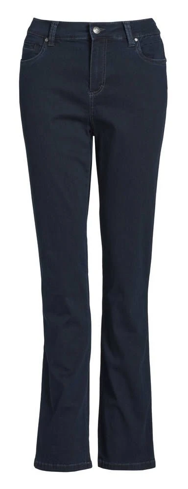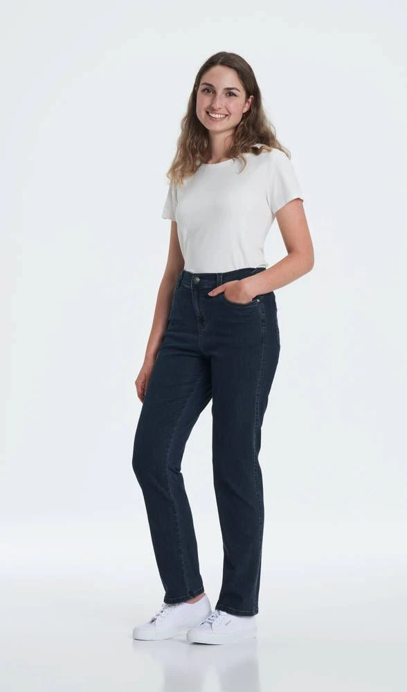 Pehmeästä ja joustavasta materaalista valmistetut suoralahkeiset farkut. Joustava vyötärönauha lisää farkkujen käyttömukavuutta.
