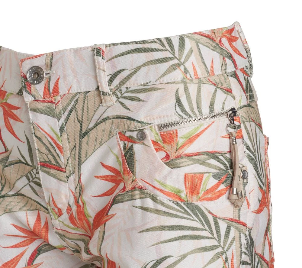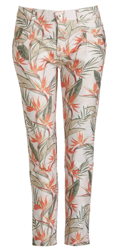 Värikkäät lehtikuosiset housut etu- ja takataskuilla sekä vajaamittaisilla lahkeilla. Toisen taskun sisäpuolella on vetoketjullinen koristetasku. Joustava materiaali parantaa istuvuutta ja lisää käyttömukavuutta.