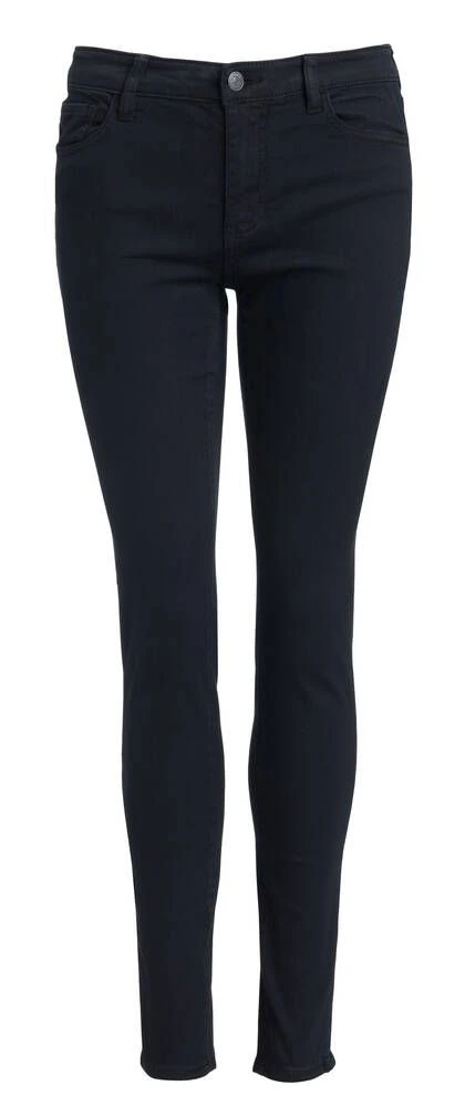 Naisten erittäin kapeat 5-taskufarkut normaalikorkuisella vyötäröllä. Joustava materiaali lisää käyttömukavuutta.