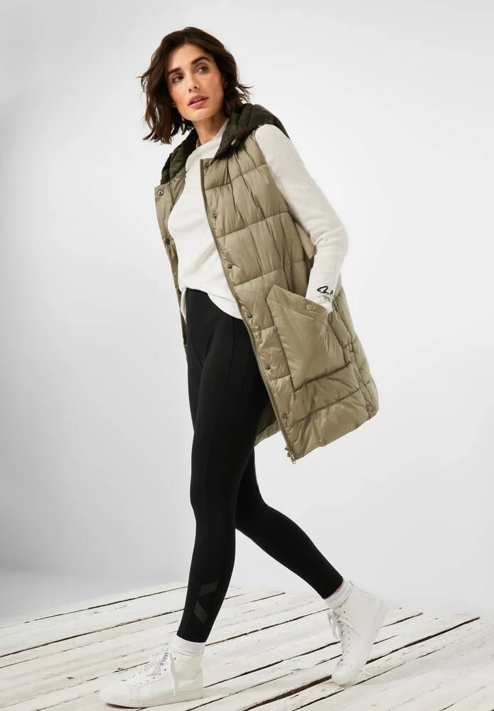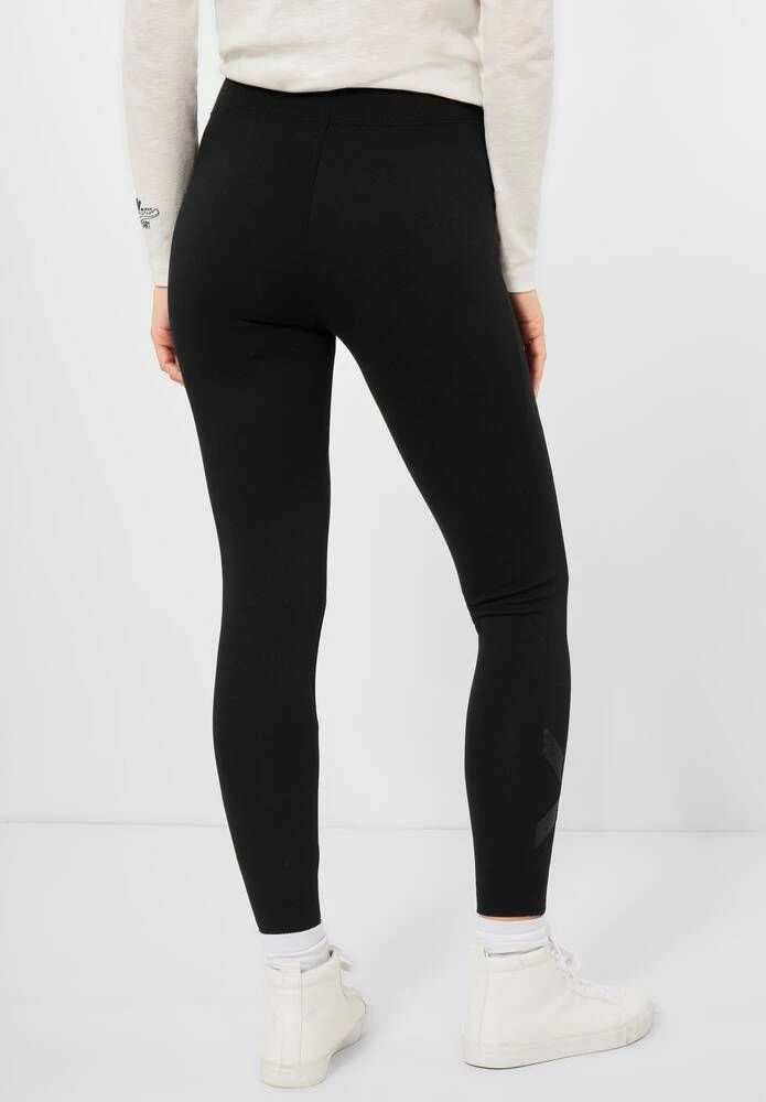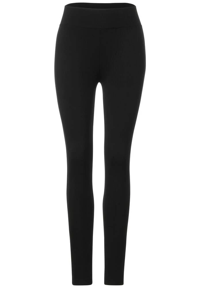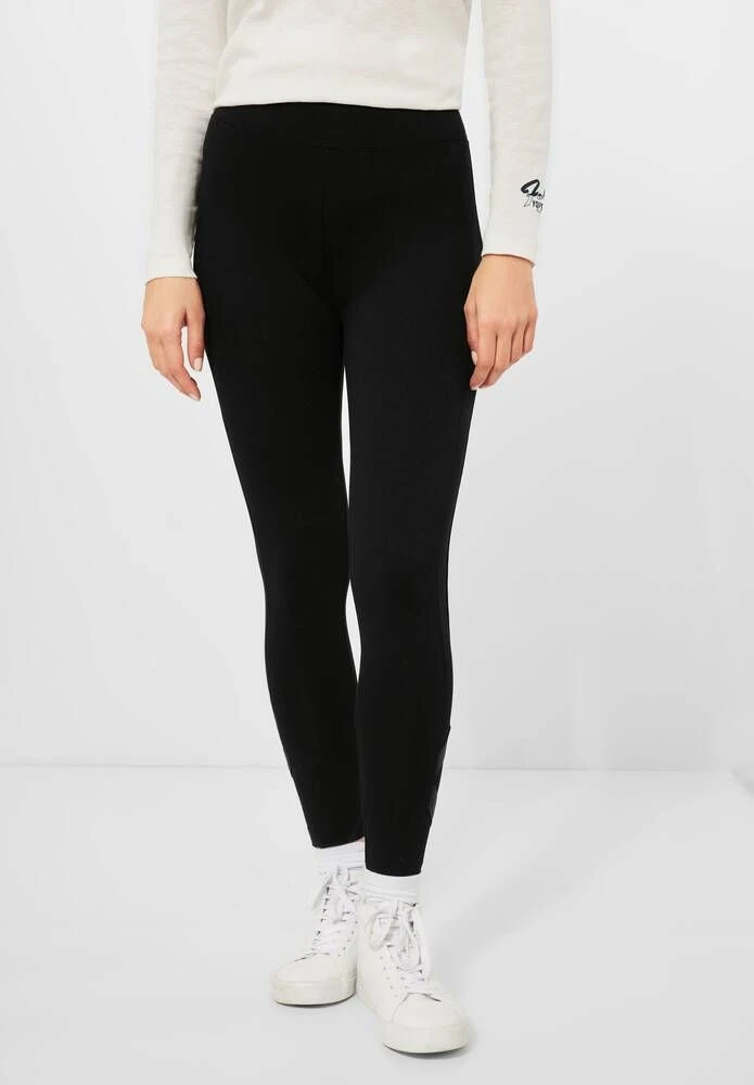 Naisten yksiväriset, paksut leggingsit leveällä vyötärökaistaleella. Lahkeensuissa on hillityt koristeet.