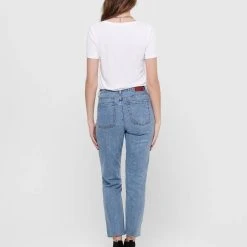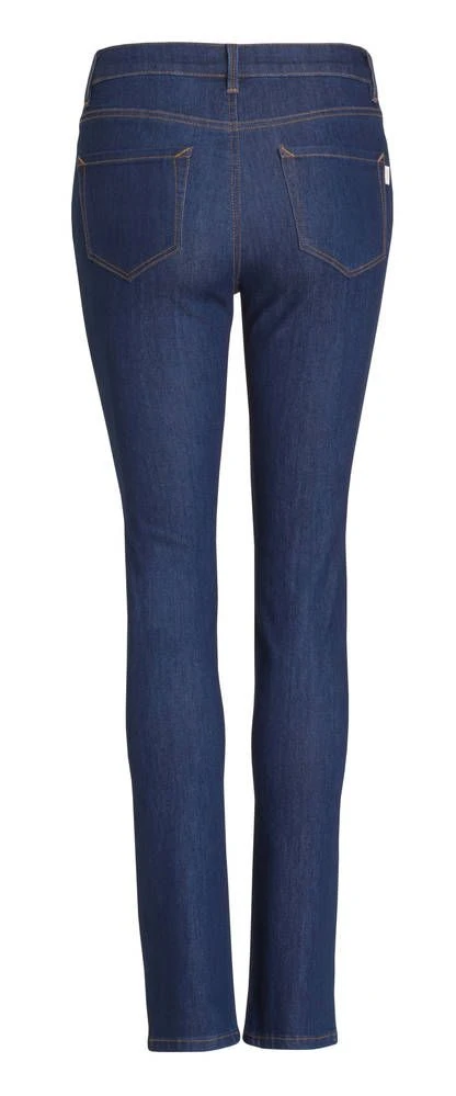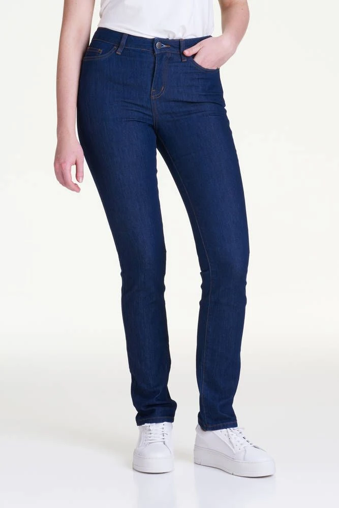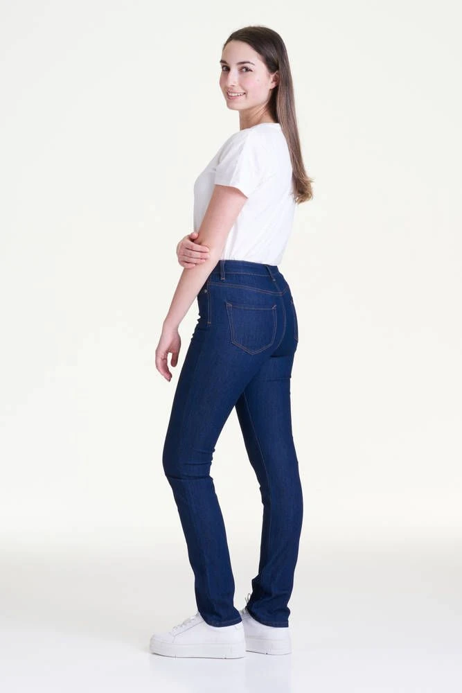 Miellyttävän joustavat tummansiniset farkut suorilla lahkeilla ja normaalikorkuisella vyötäröllä. Farkuissa on sekä etu- että takataskut.