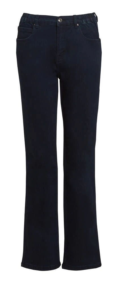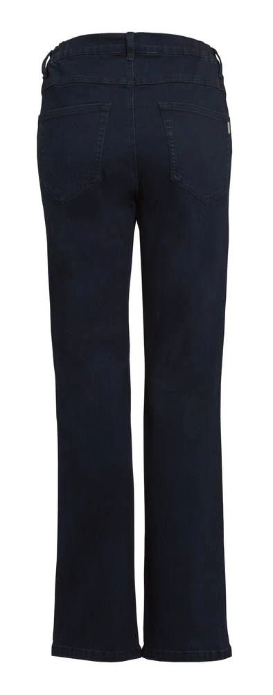 Tummansiniset erittäin joustavat farkut suorilla lahkeilla sekä etu- ja takataskuilla. Miellyttävän tilava malli sekä osittainen kuminauhavyötärö takaavat käyttömukavuuden.