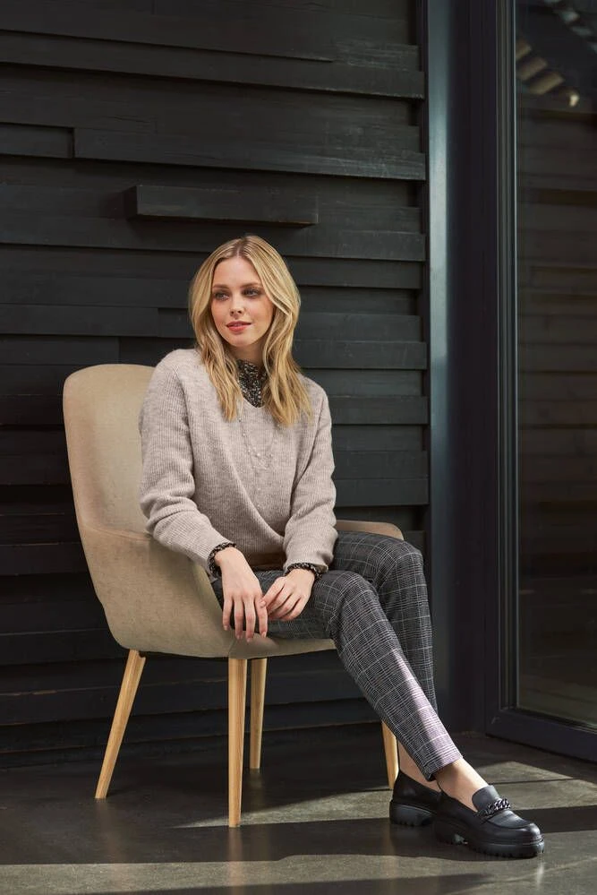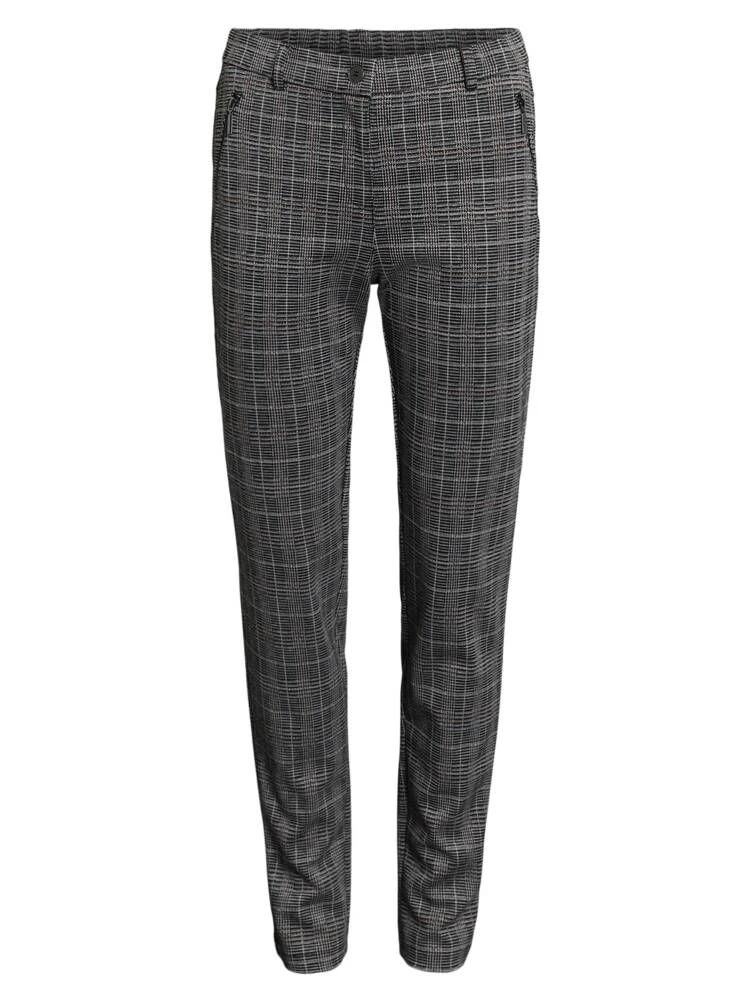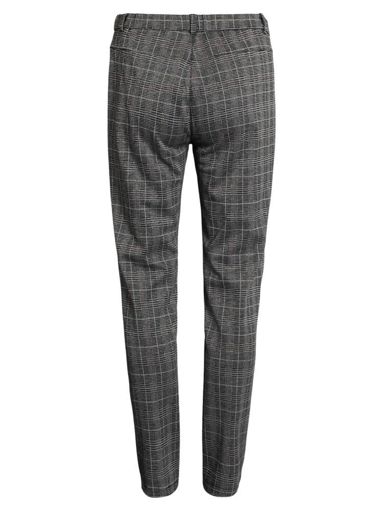 Tyylikkäät ruutuhousut etupuolen vetoketjutaskuilla ja kapeahkoilla lahkeilla. Housujen joustava materiaali lisää käyttömukavuutta.
