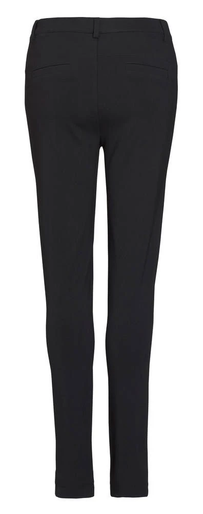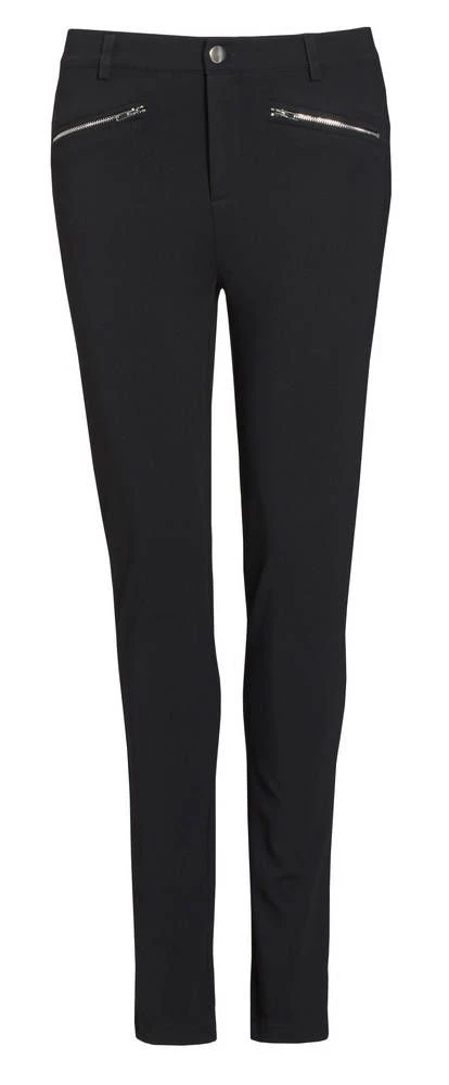 Naisten kapealahkeiset trikoohousut koristevetoketjulla.