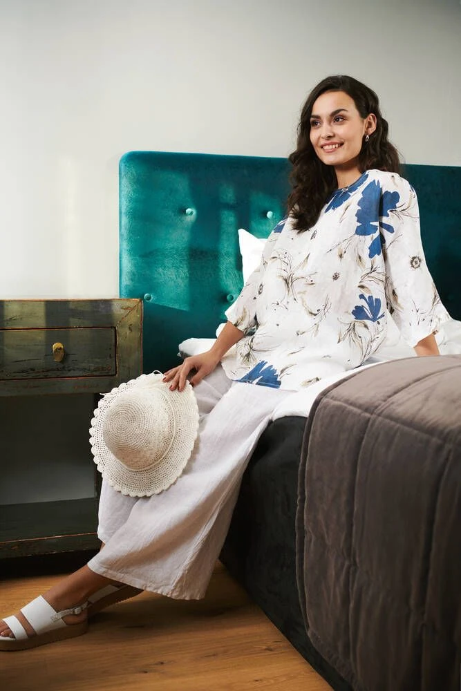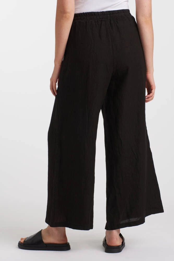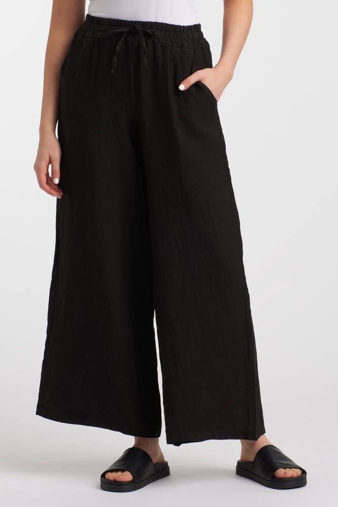 Naisten yksiväriset pellavahousut upeilla, erittäin leveillä lahkeilla sekä miellyttävällä kuminauhavyötäröllä. Korkeavyötäröisten housujen etupuolella on tilavat avotaskut.