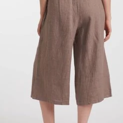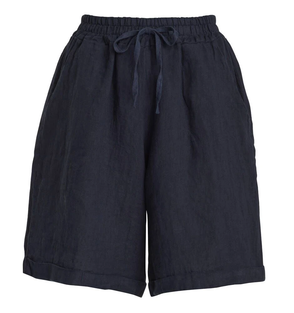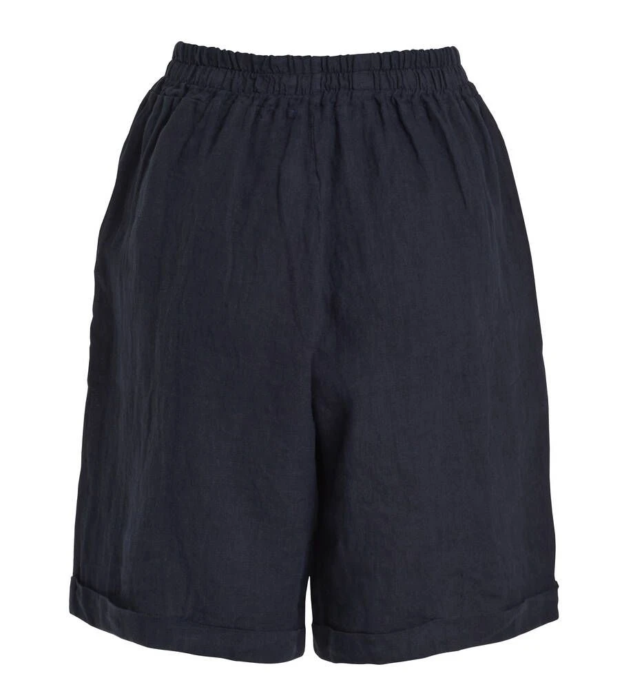 Naisten väljät ja yksiväriset pellavashortsit miellyttävällä kuminauhavyötäröllä ja koristenauhoilla.
