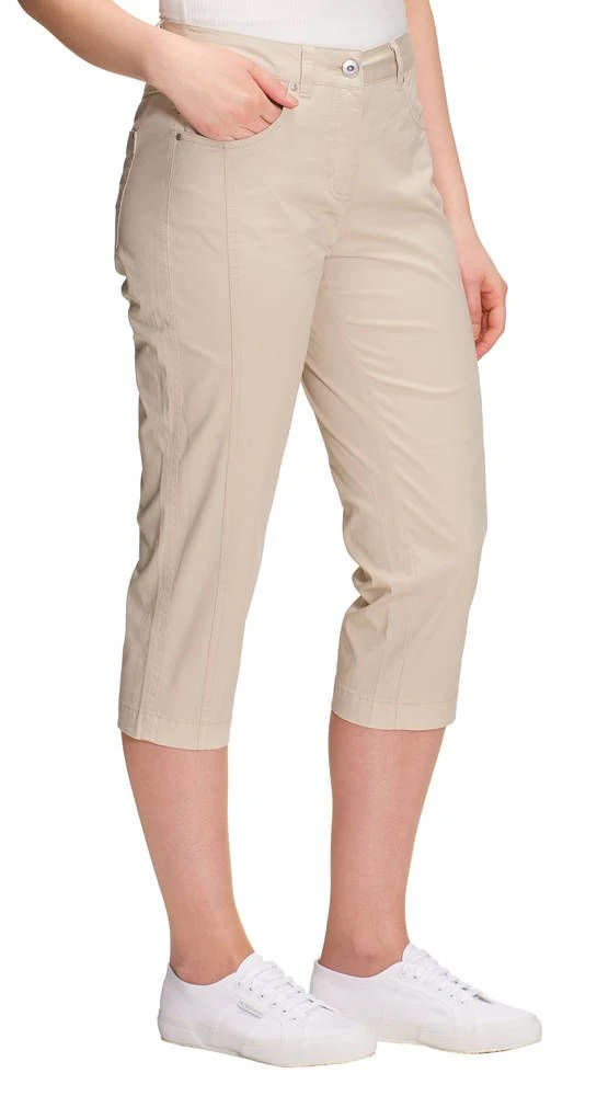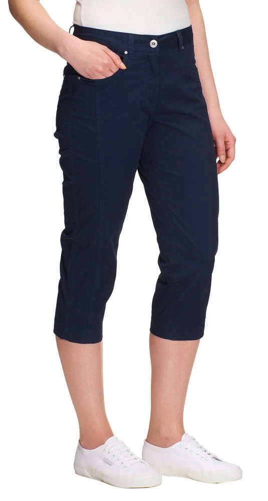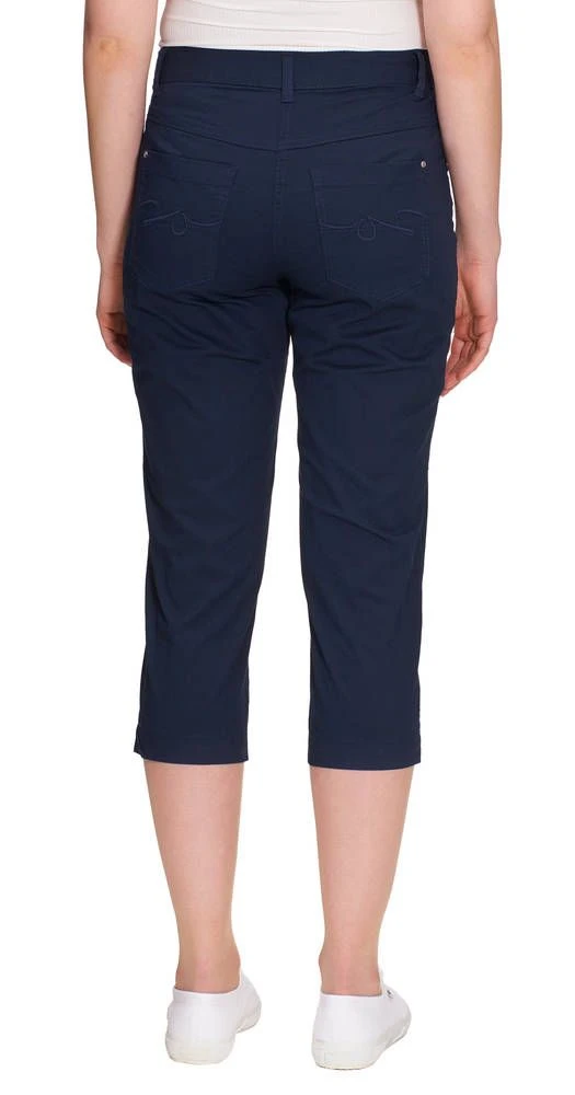 Rennot yksiväriset caprit etu- ja takataskuilla. Housujen etupuolella on näyttävät pystysaumat ja etutaskuissa tyylikkäät koristetikkaukset. Selkäpuolen paikkataskuissa on näyttävät brodeeraukset.