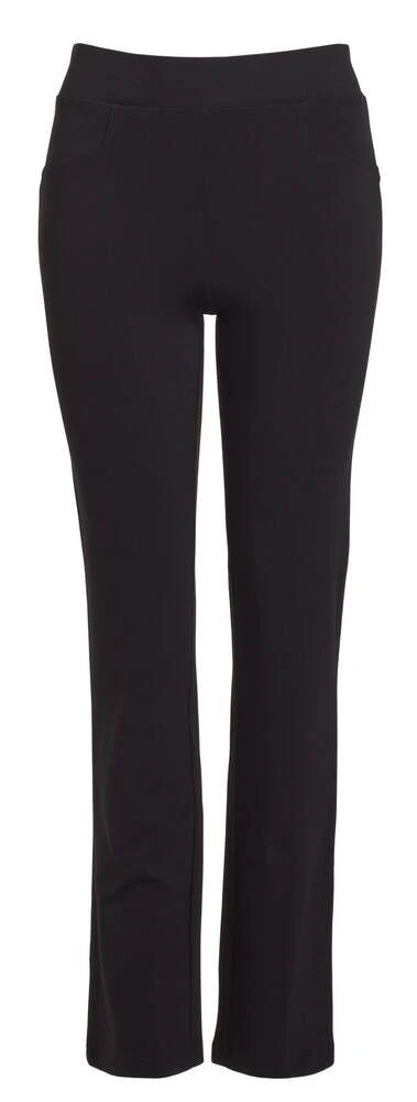 Naisten paksusta trikoosta valmistetut yksiväriset housut miellyttävällä kuminauhavyötäröllä ja suorilla lahkeilla.