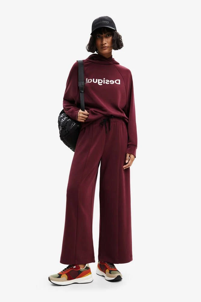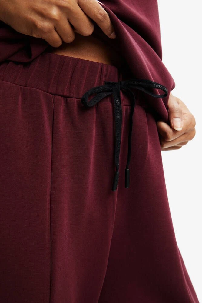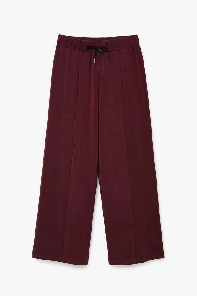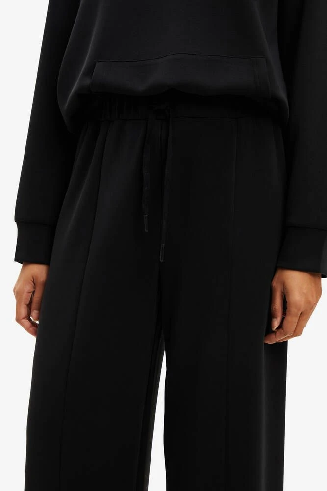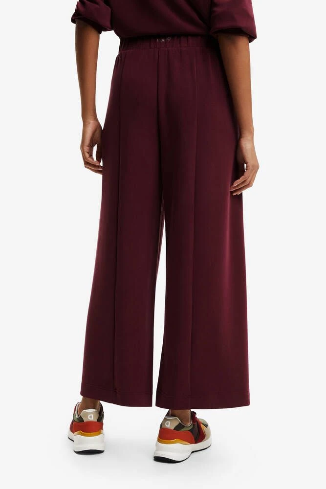 Naisten leveälahkeiset housut miellyttävällä kuminauhavyötäröllä ja nauhalla. Lahkeiden etupuolen keskiosissa on koristesaumat.