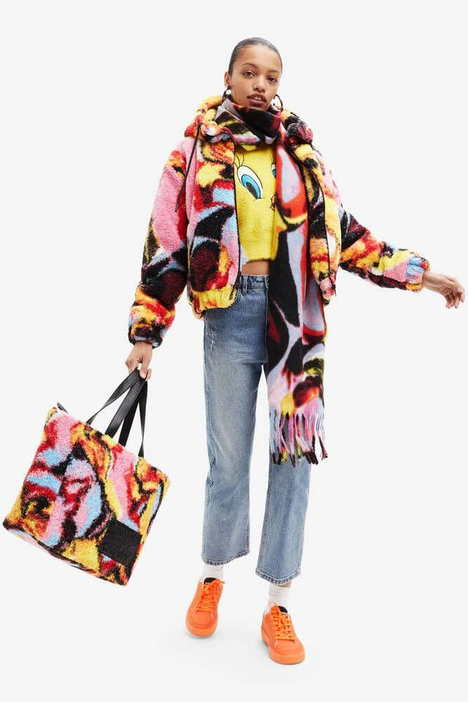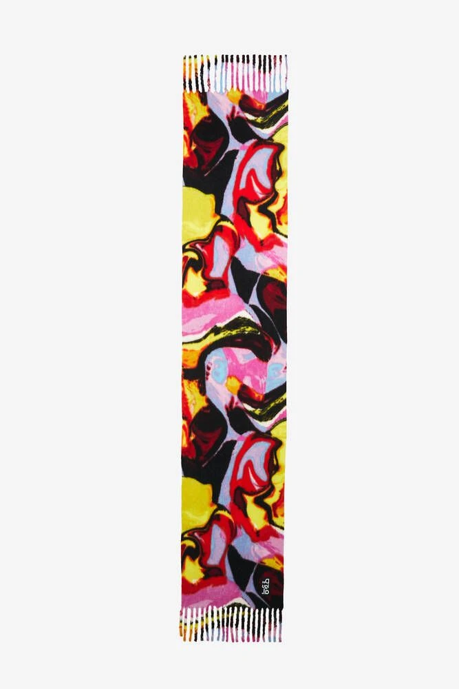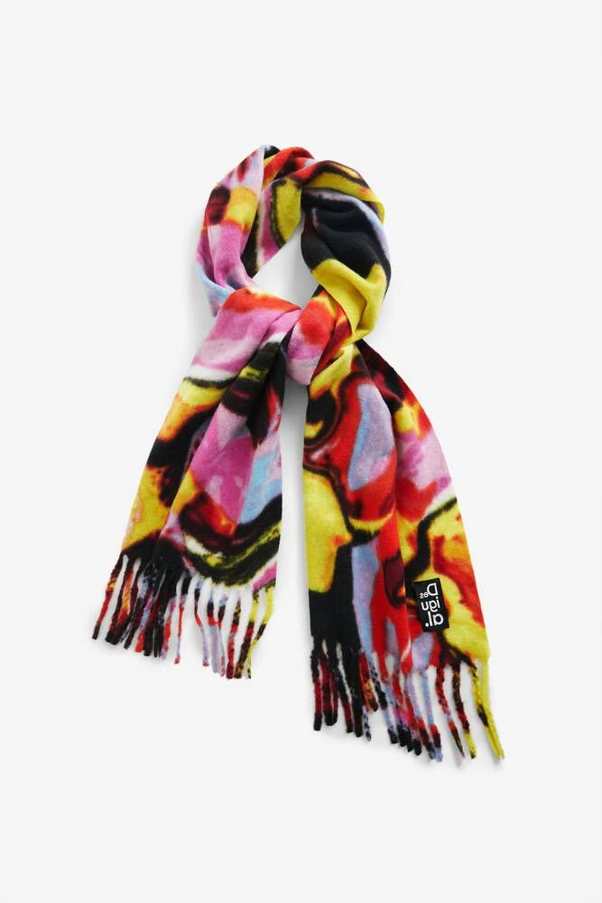 Naisten värikäs huivi tyylikkäillä hapsuilla.