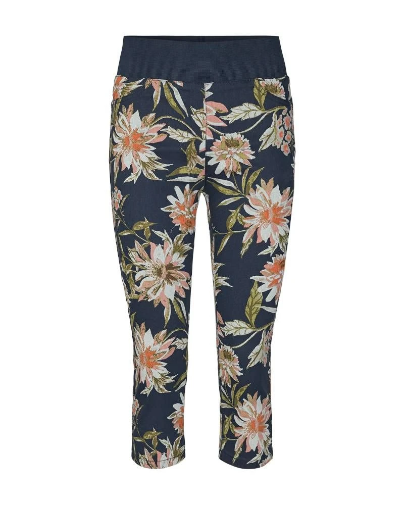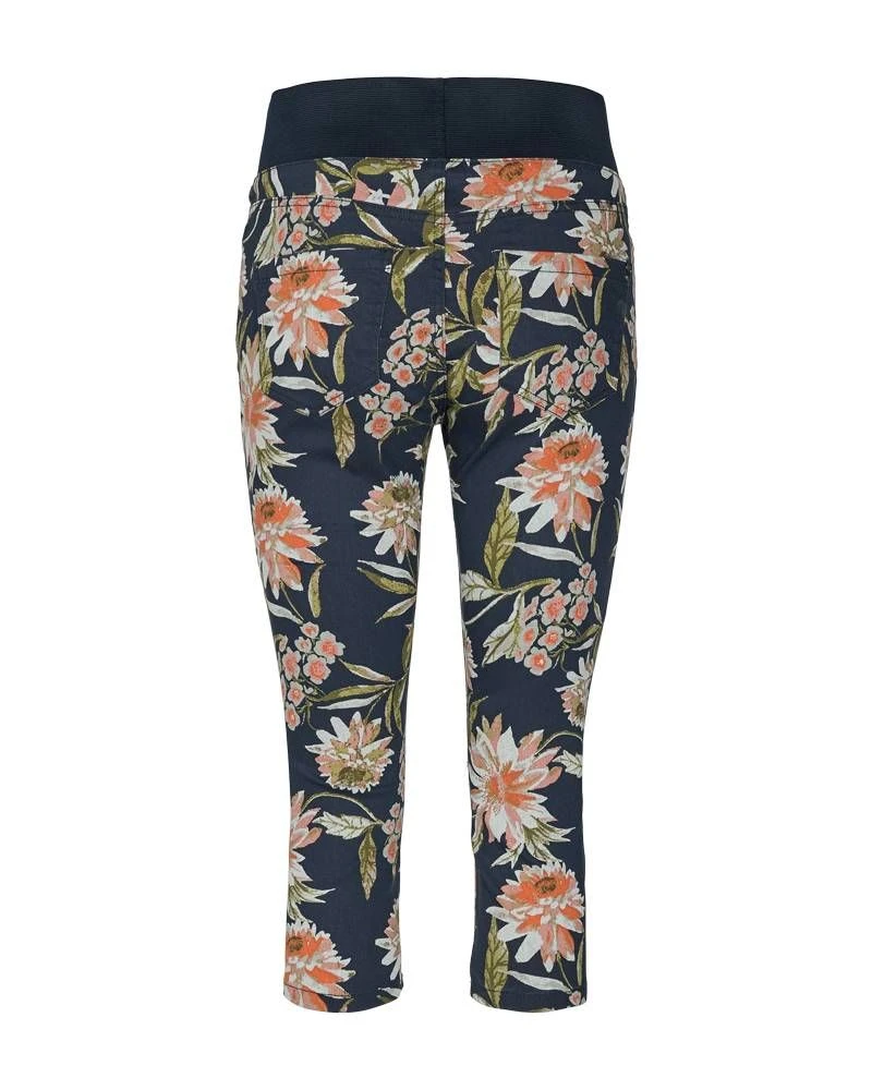 Ihanan joustavat kukkakuvioiset caprit miellyttävällä kuminauhavyötäröllä. Housujen etupuolella on valetaskut ja takana paikkataskut.