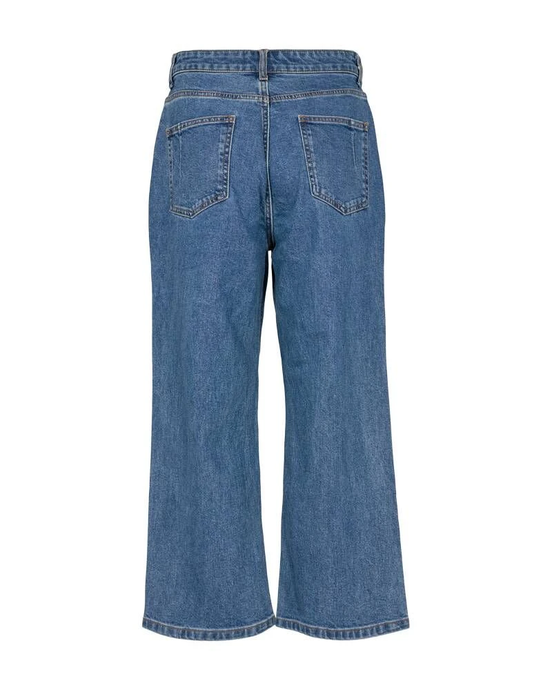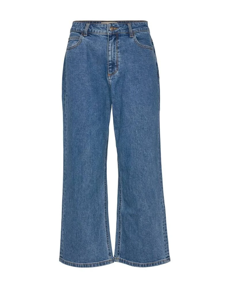 Pehmeästä materiaalista valmistetut luomupuuvillaiset farkut vajaamittaisilla lahkeilla. Näyttävän leveät lahkeet viimeistelevät kokonaisuuden.