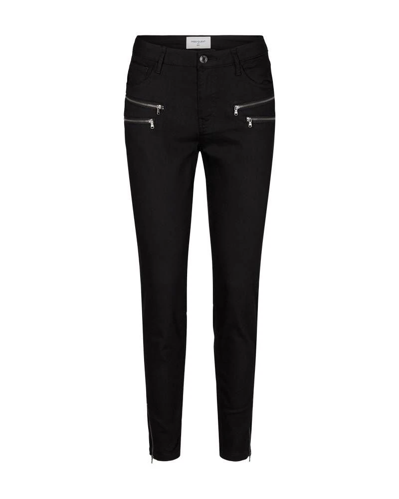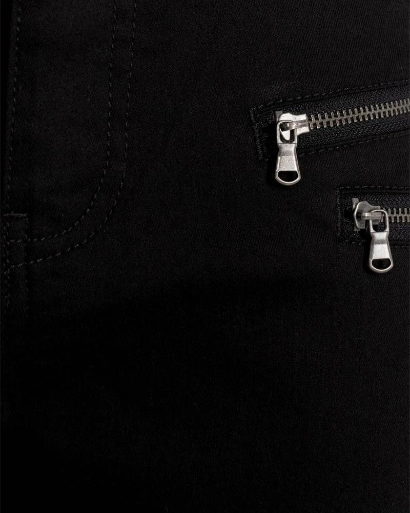 Ihanan joustavat yksiväriset housut etu- ja takataskuilla. Housujen etupuolella on neljä vetoketjullista koristetaskua ja lahkeensuissa avattavat vetoketjut.