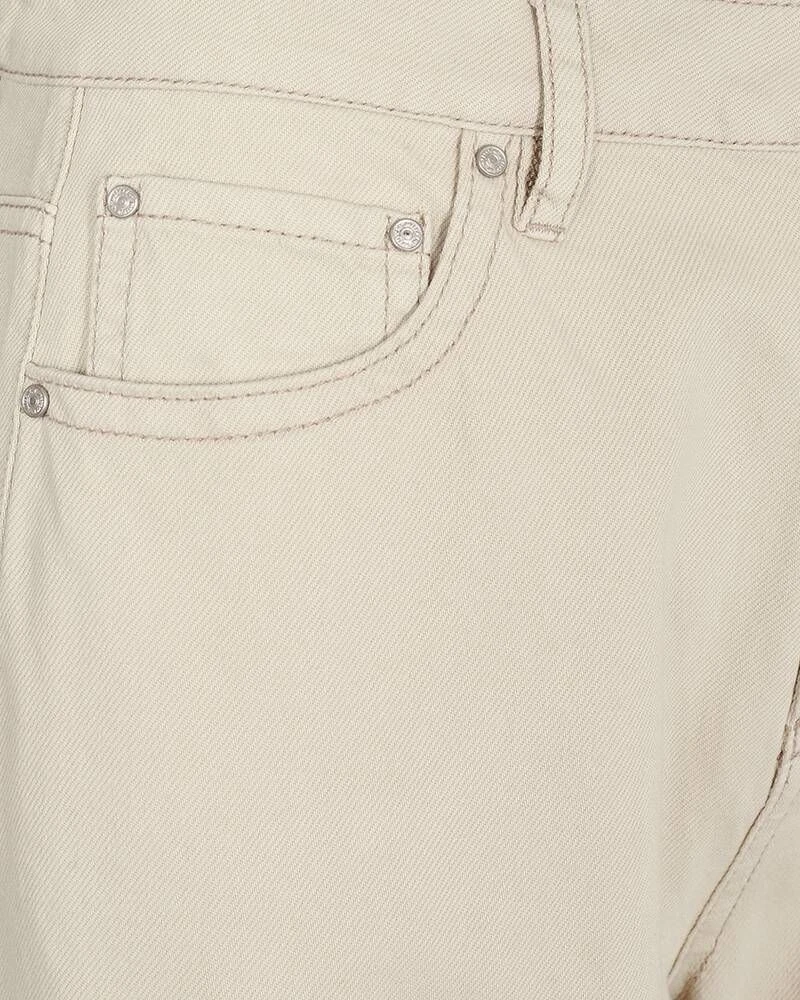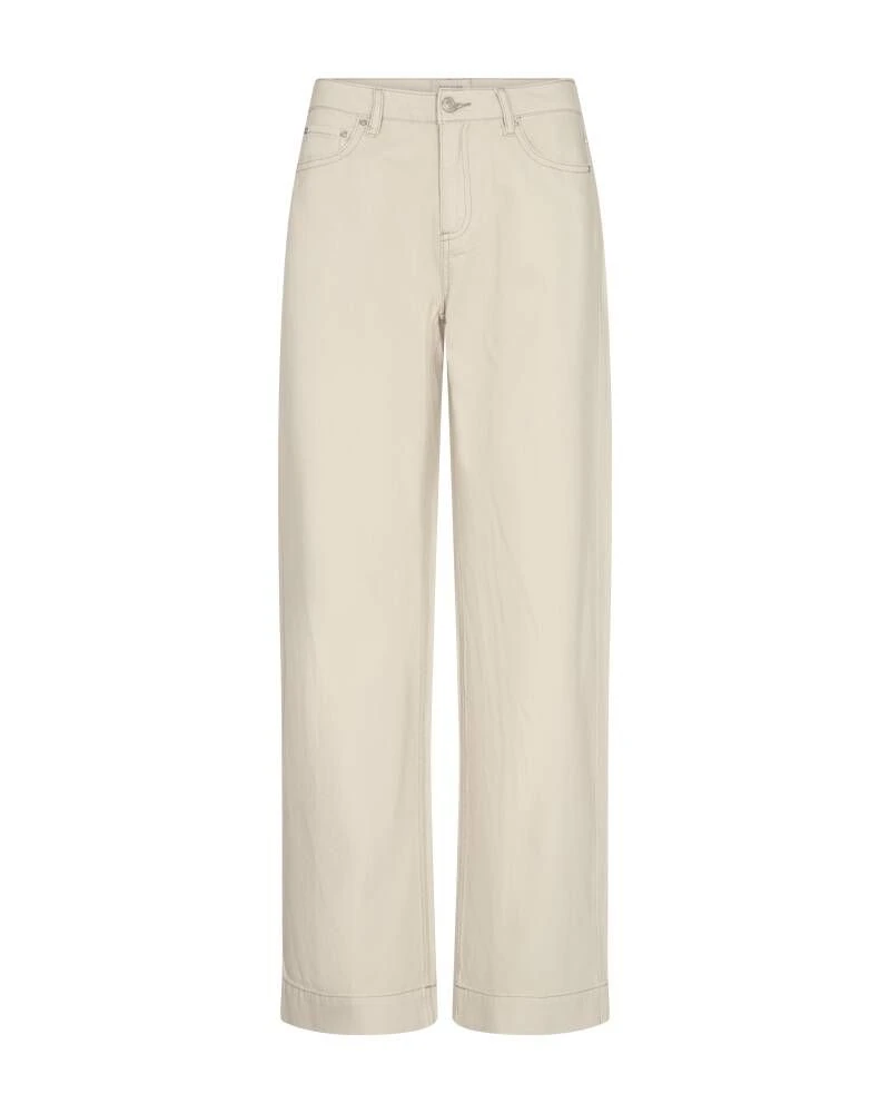 Naisten korkeavyötäröiset twill-housut suorilla lahkeilla.