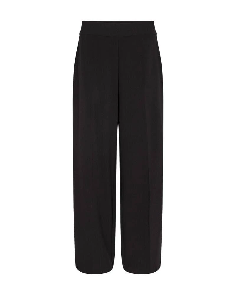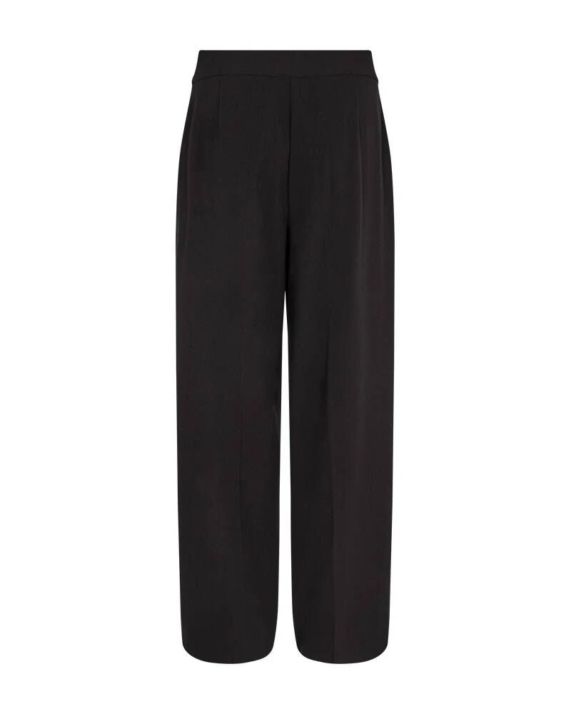 Naisten leveälahkeinen housu laskeutuvasta materiaalista. Housuissa on piilovetoketju sivusaumassa.