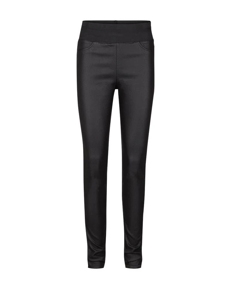 Freequentin kiiltäväpintaiset kapealahkeiset housut. Housuissa on leveä kuminauha vyötärö. Somiste taskut edessä.