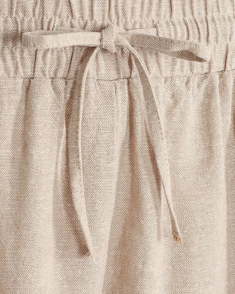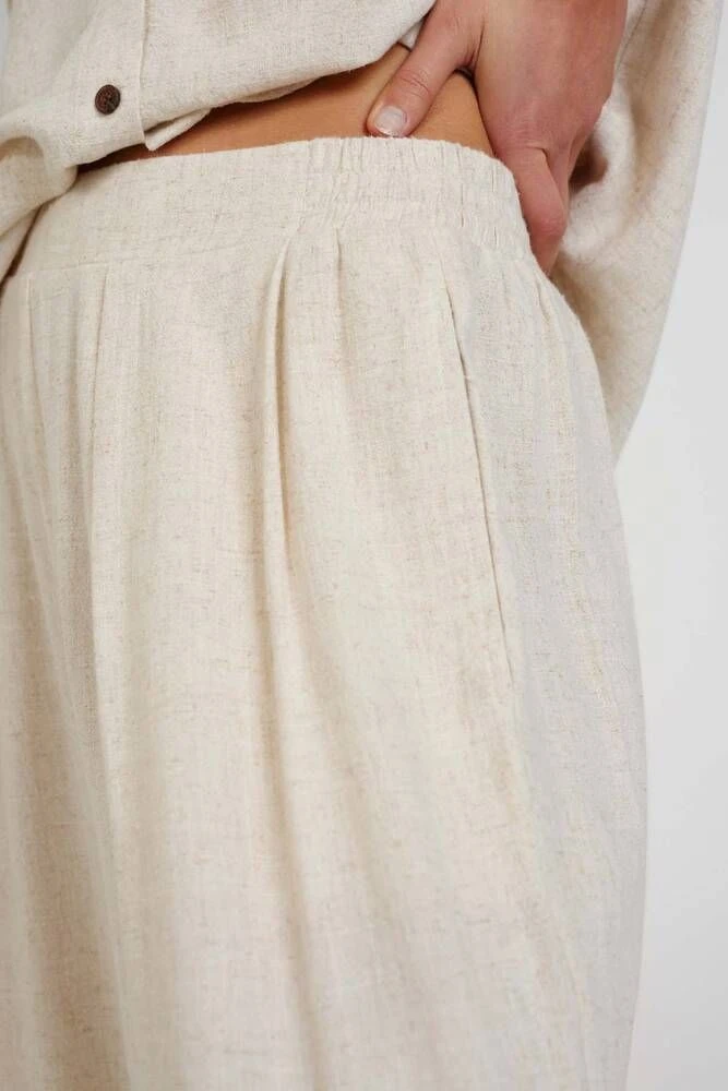 Naisten pellavahousut kuminauhavyötäröllä ja taskuilla. Housuissa on vajaamittaiset lahkeet.