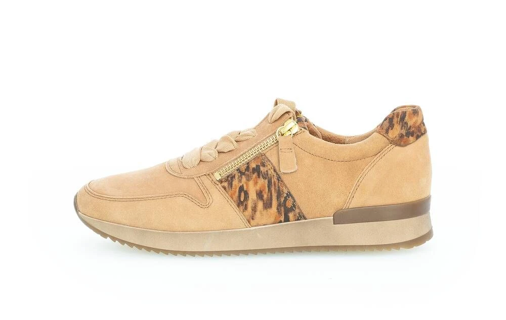 Matalalla kiilapohjalla varustetut mokkaiset sneakerit nauha- ja vetoketjukiinnityksellä. Eläinkuosiset osiot viimeistelevät tyylikkään kokonaisuuden.