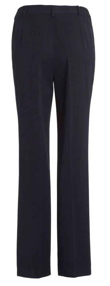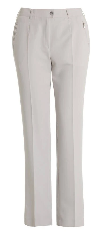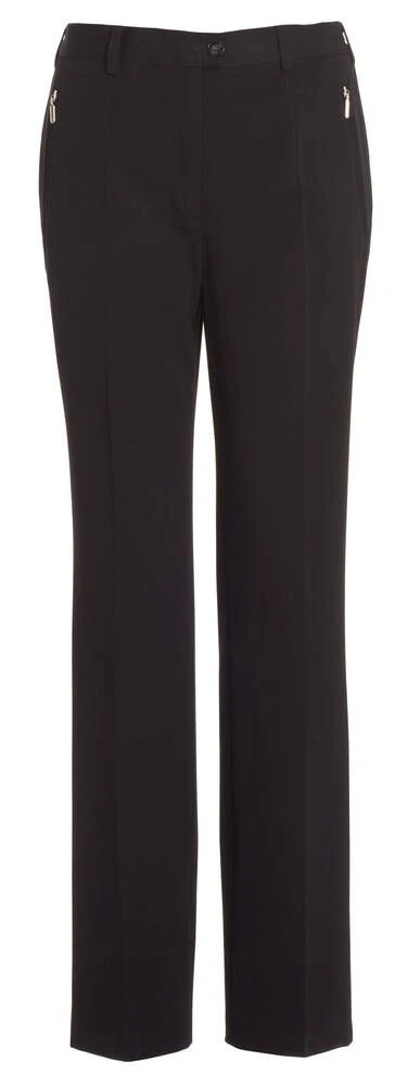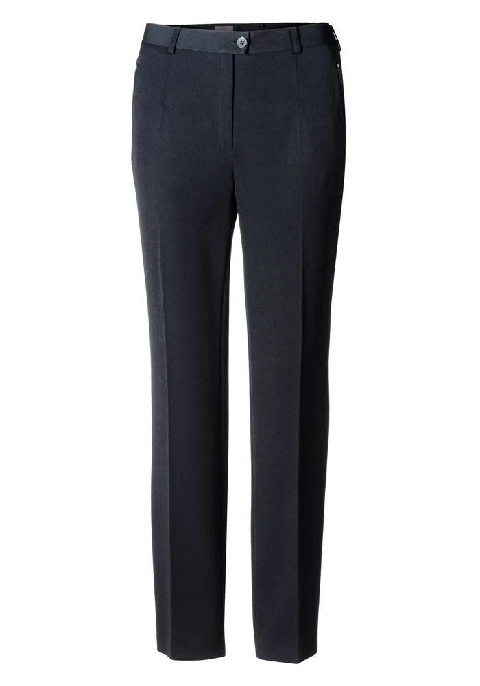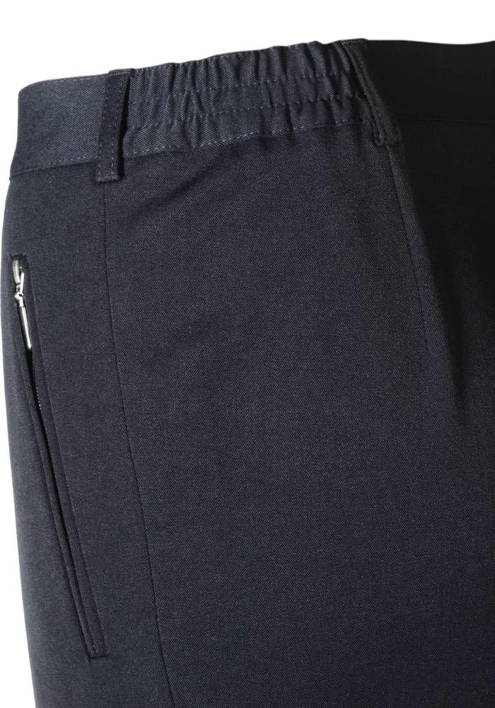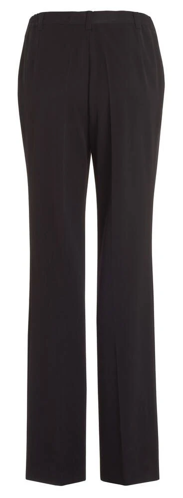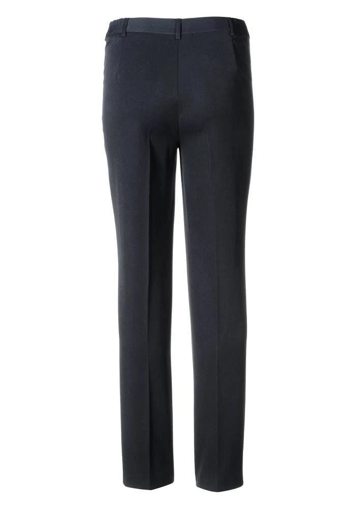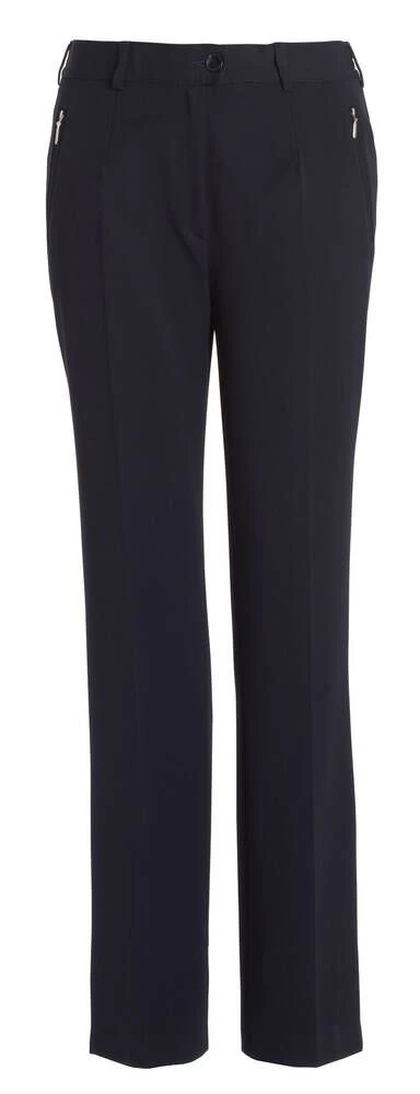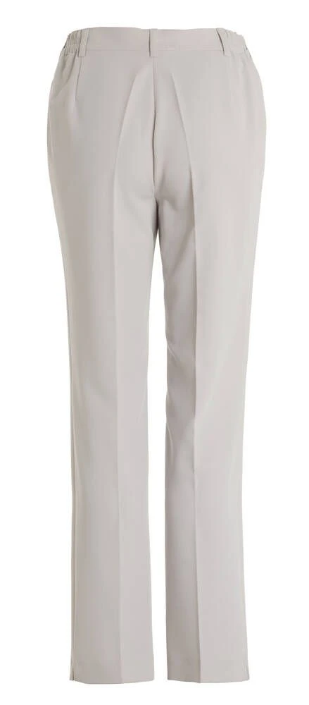 Siistit prässihousut kätevillä vetoketjutaskuilla. Osittainen kuminauhavyötärö lisää housujen käyttömukavuutta.