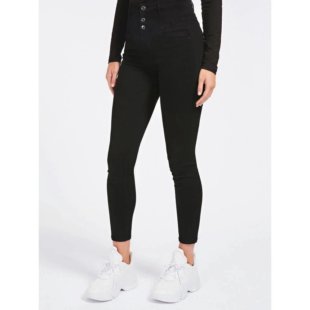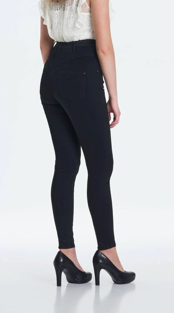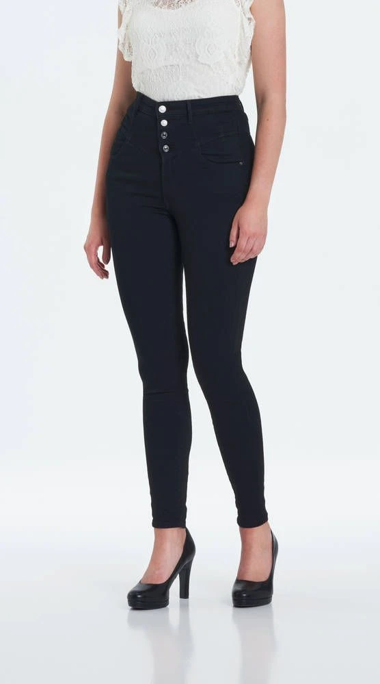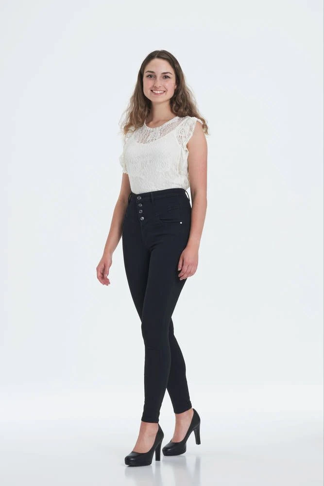 Näyttävät todella korkea vyötäröiset farkut kapeilla lahkeilla. Mallilla on päällä koko 27/29. Mallin pituus on 170 cm, rinnanympärys 84 cm ja vyötärönympärys 64 cm.