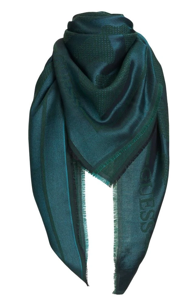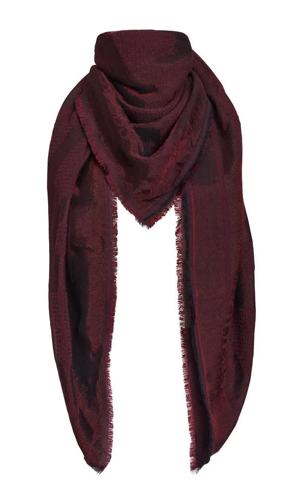 Kiiltäväpintainen iso huivi jacquard-kuvioinnilla. Neliönmallisessa huivissa on tyylikkäät hapsureunat.