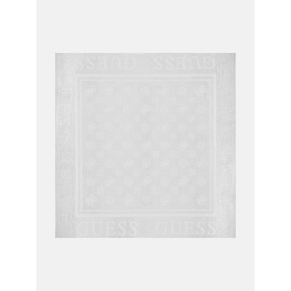 Hiukan kimaltelevapintainen huivi vaaleanharmaalla pohjalla ja haalealla Guess-kuvioinnilla.