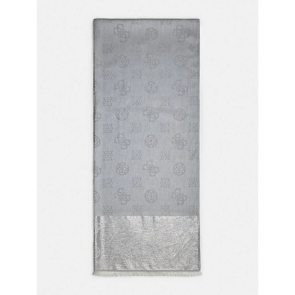 Raakareunainen huivi vaalealla Guess-kuvioinnilla.