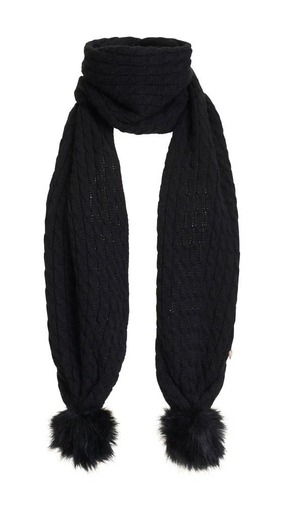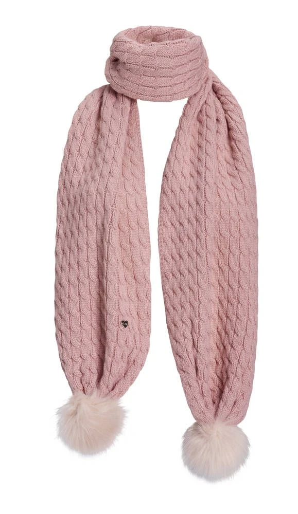Kuvioneulottu yksivärinen huivi, jonka päissä on pehmeät karvatupsut.