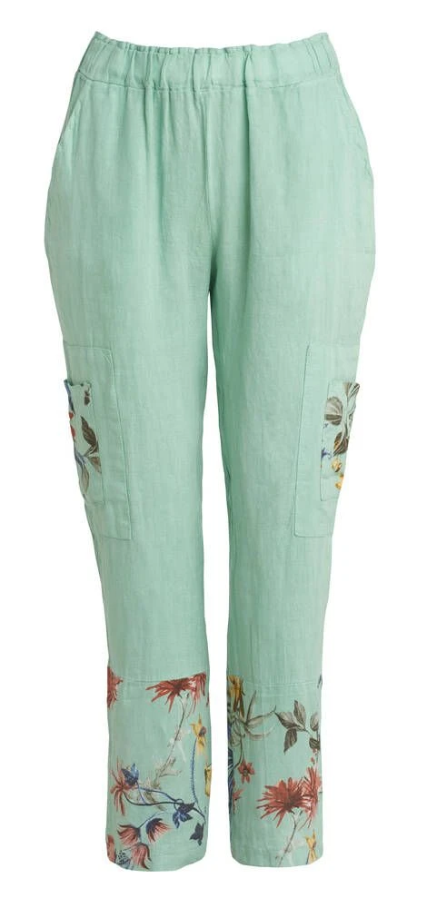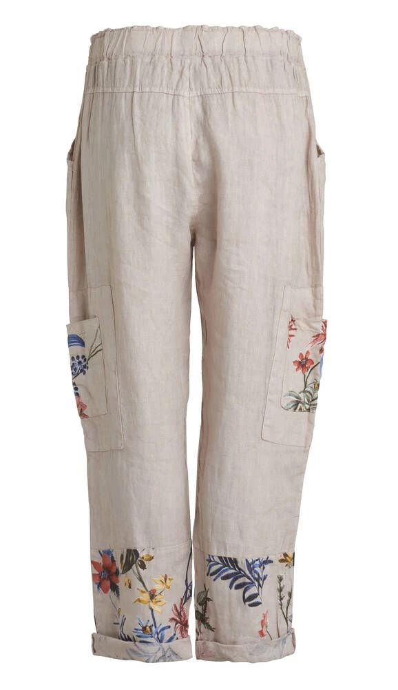 Naisten miellyttävät pellavahousut käännetyillä lahkeilla. Kukkakuvioiduissa housuissa on tilavat etutaskut sekä reisitaskut. Joustava kuminauhavyötärö lisää käyttömukavuutta.
