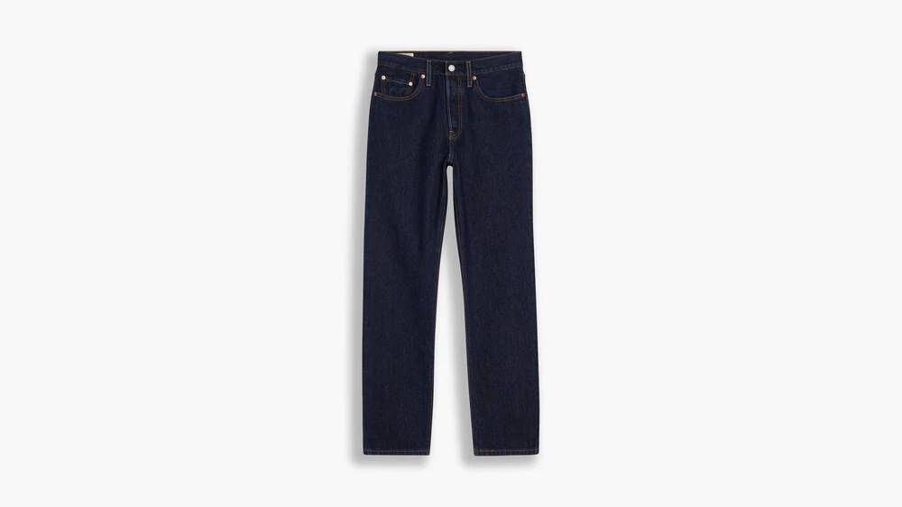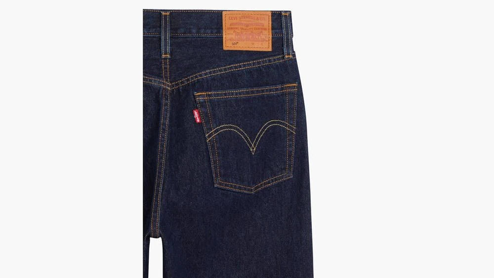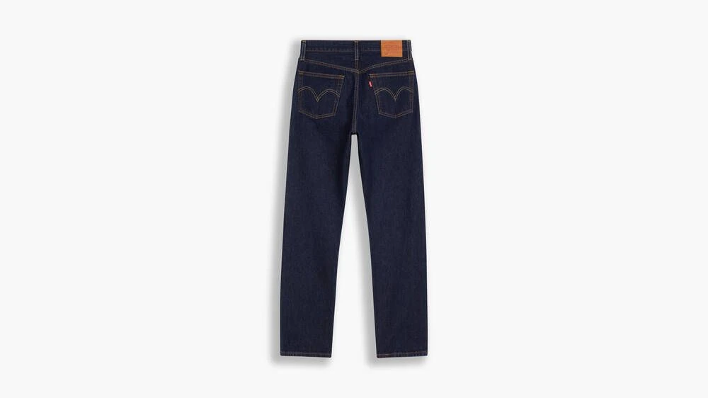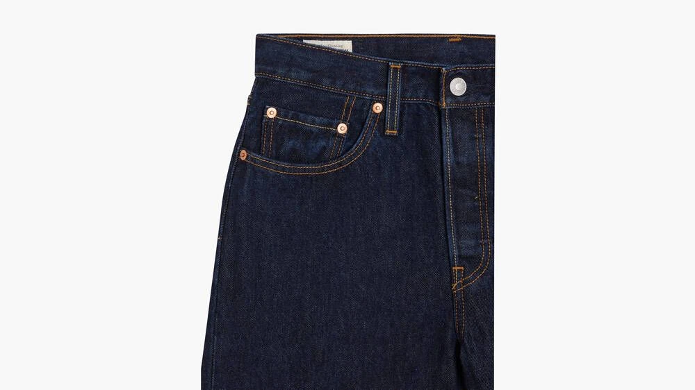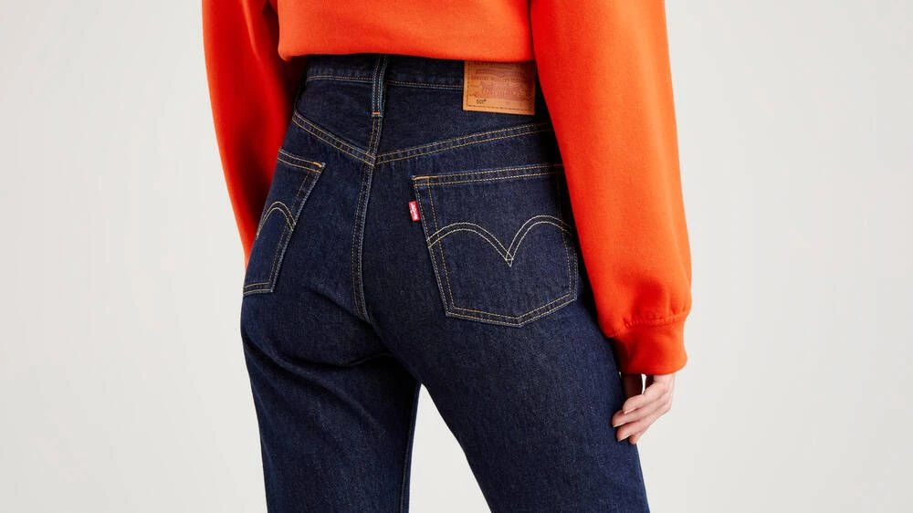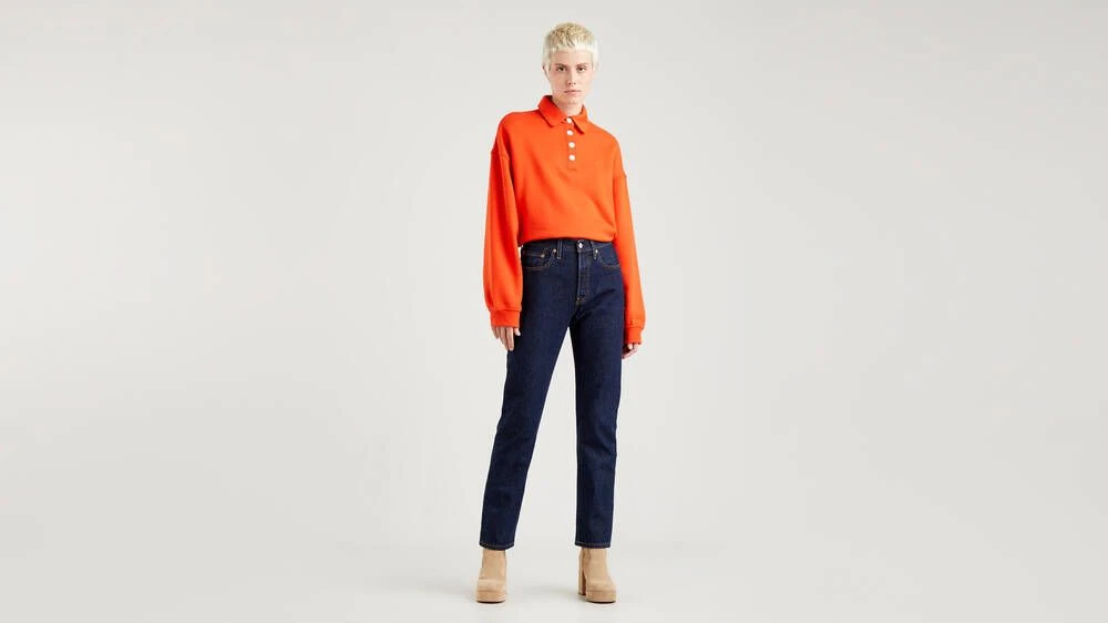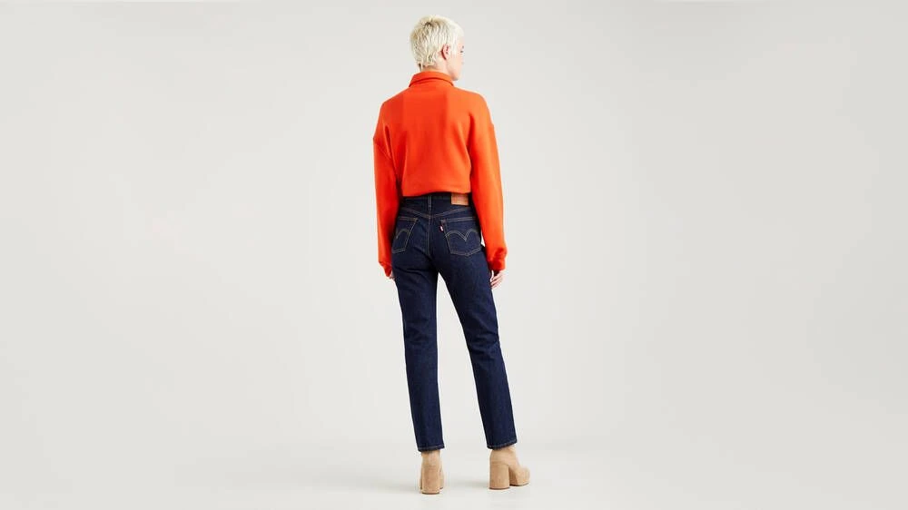 Naisten klassiset 501-farkut korkealla vyötäröllä ja tasaisella tummalla pesulla.