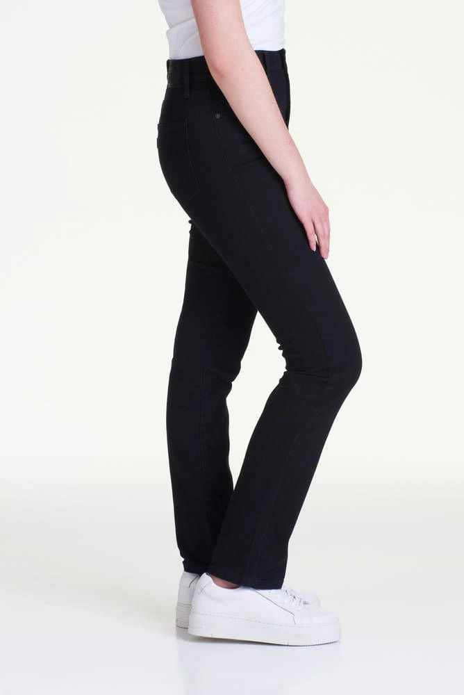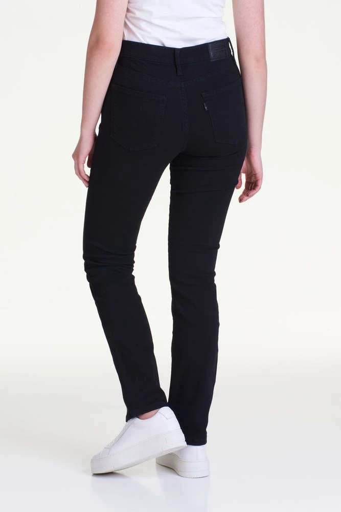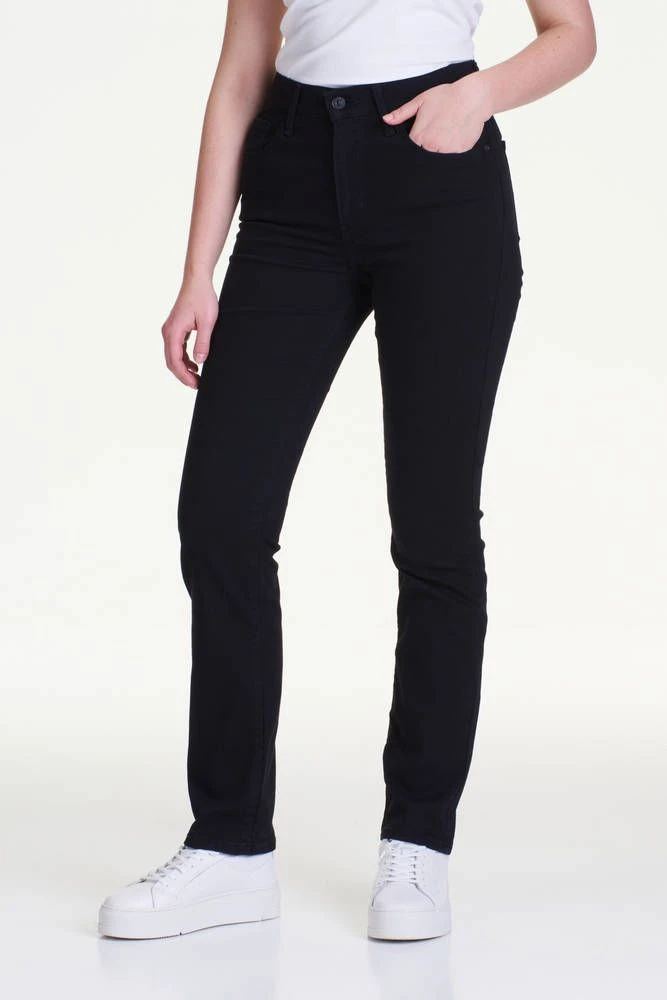 Suoralahkeiset farkut korkealla vyötäröllä sekä etu- ja takataskuilla. Farkkujen joustava materiaali parantaa istuvuutta ja lisää käyttömukavuutta.
