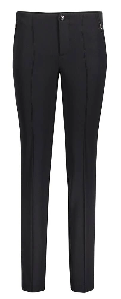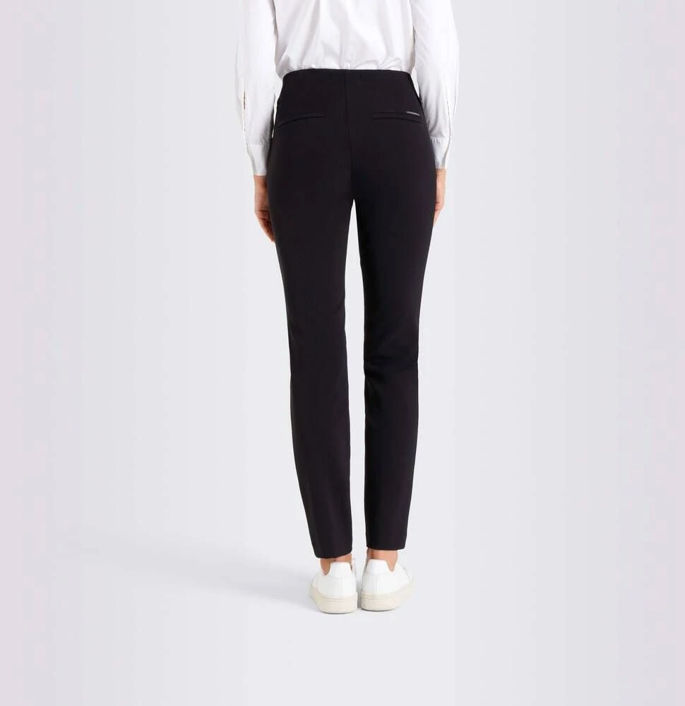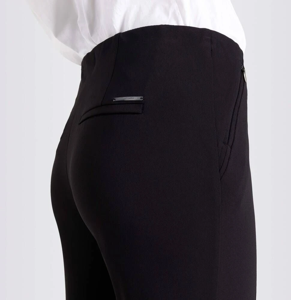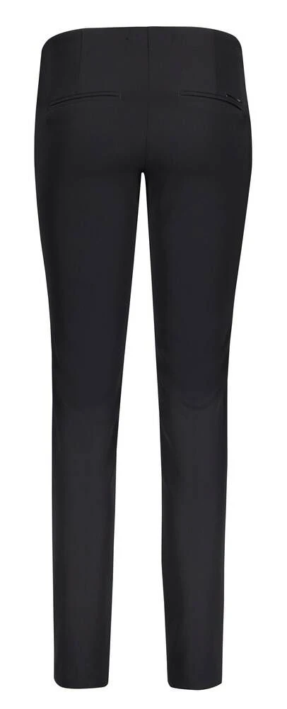 Naisten siistit kapealahkeiset housut tikatuilla etuprässeillä ja normaalikorkuisella vyötäröllä. Liukaspintaisten housujen vyötärön sisäpuolella on miellyttävä kuminauha.