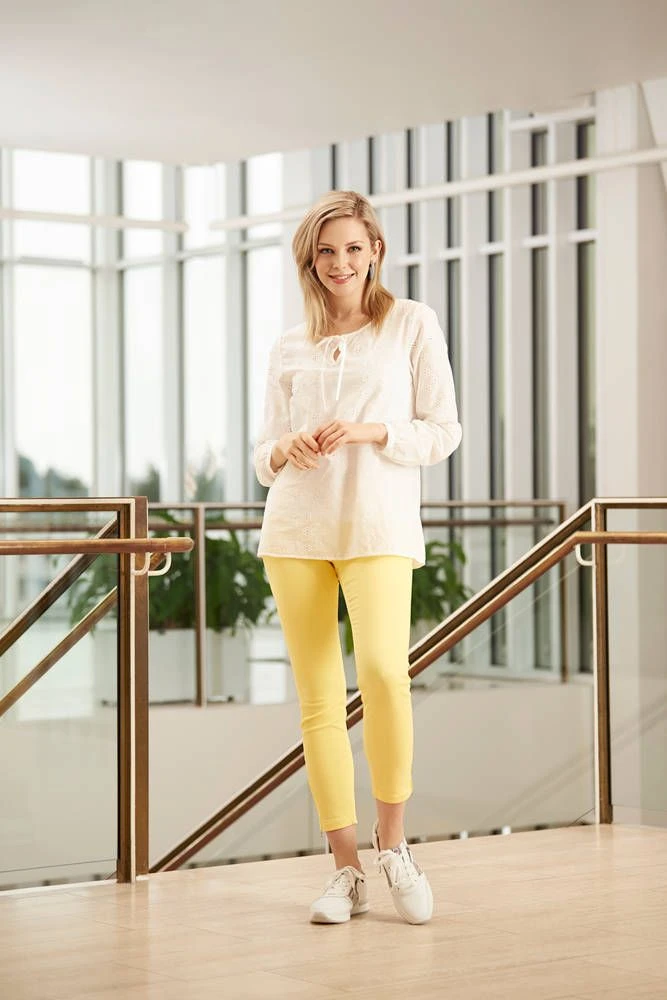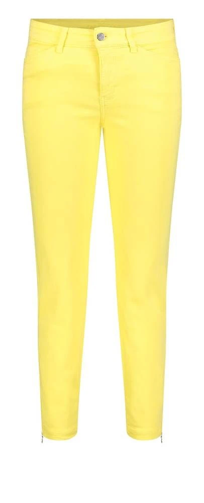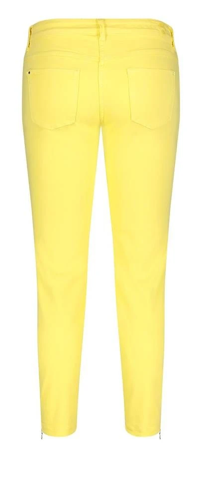 Pirteän keltaiset housut kapeilla vajaamittaisilla lahkeilla. Housuissa on normaalikorkuinen vyötärö sekä etu- ja takataskut. Lahkeensuissa on trendikkäät vetoketjut. Erittäin joustava materiaali takaa käyttömukavuuden.