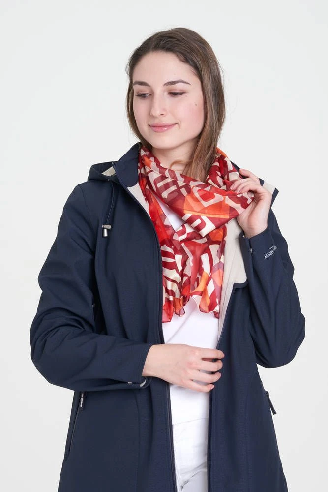 Kevyt polyesterhuivi, jossa on lämmin punasävyinen kuvio.