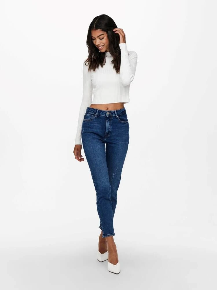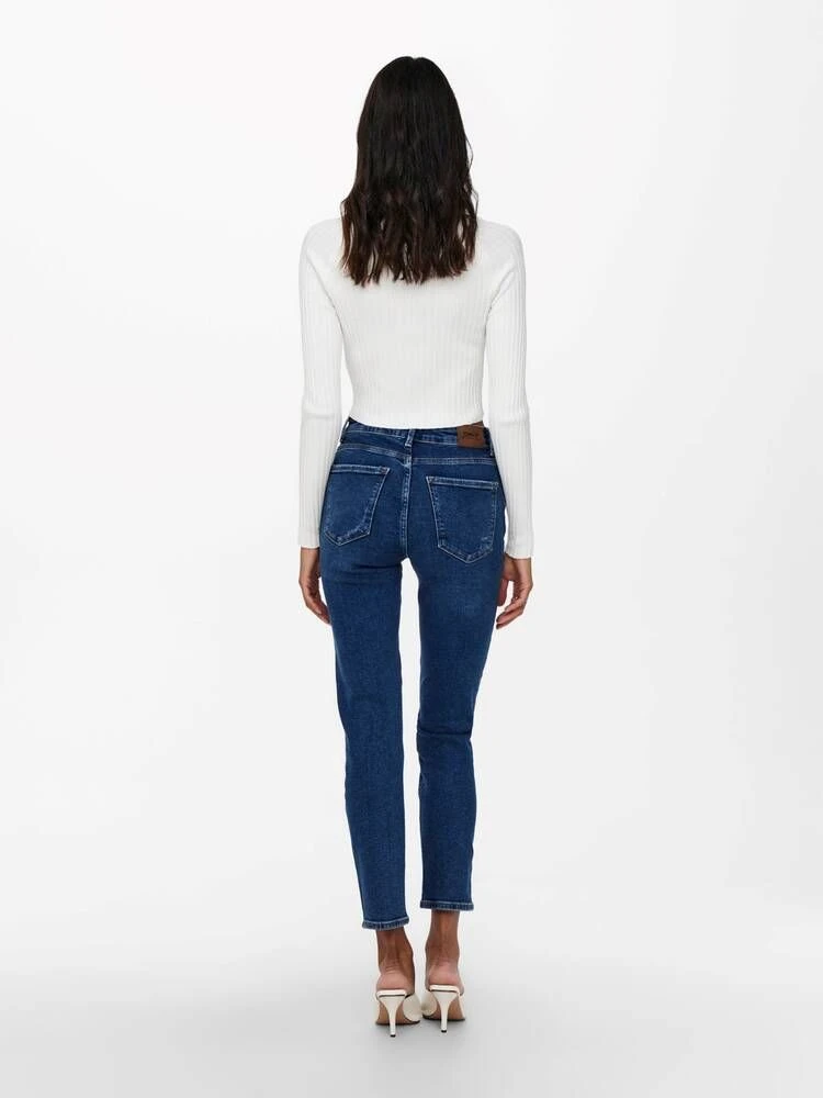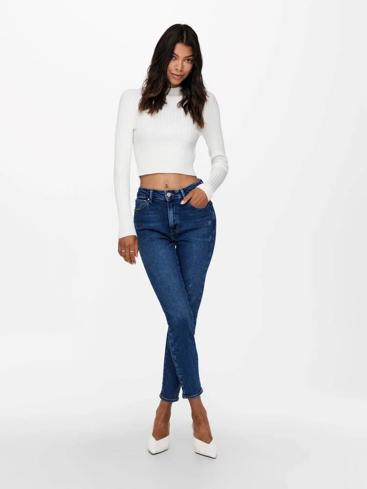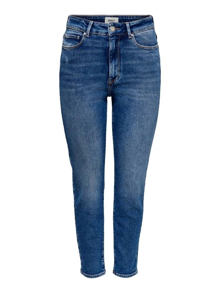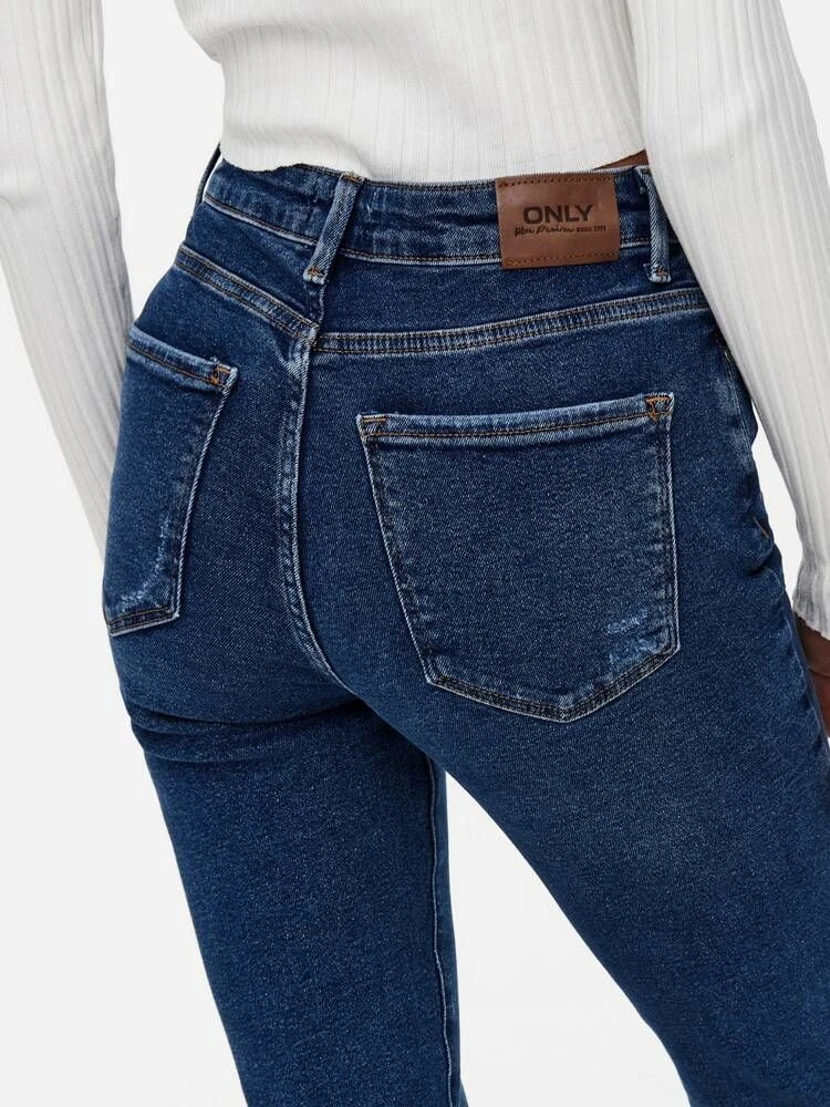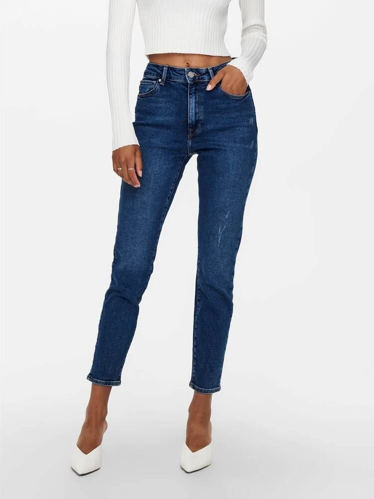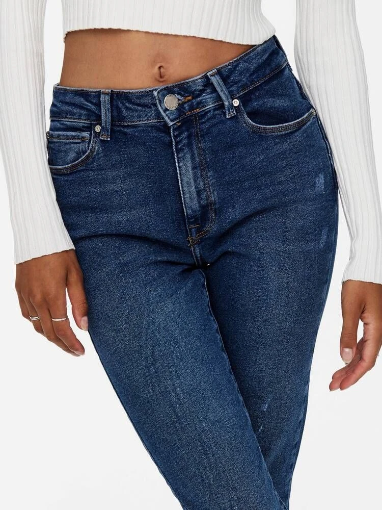 Aavistuksen kulutetut keskisiniset farkut kapeilla lahkeilla sekä etu- ja takataskuilla. Farkuissa on miellyttävän korkea vyötärö.