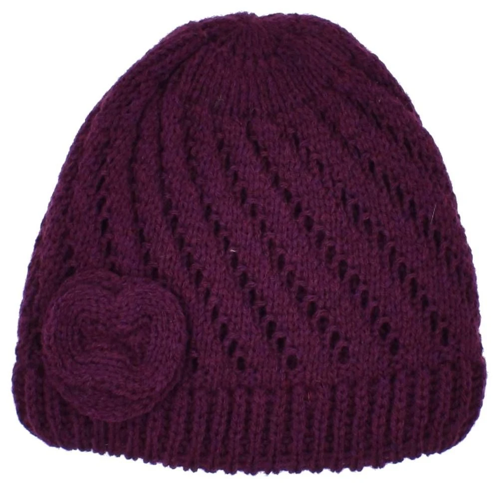 Pehmeä ja lämmin pipo kierremäisellä neuloskuviolla. Pipon etupuolella on tyylikäs neulottu koristekukka.