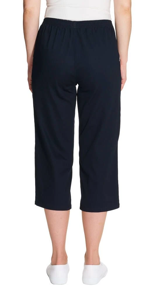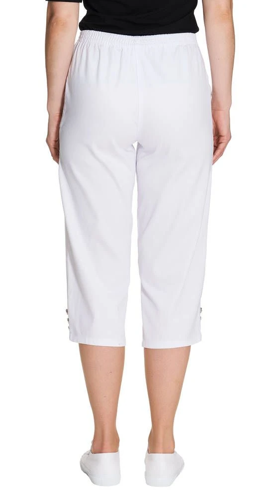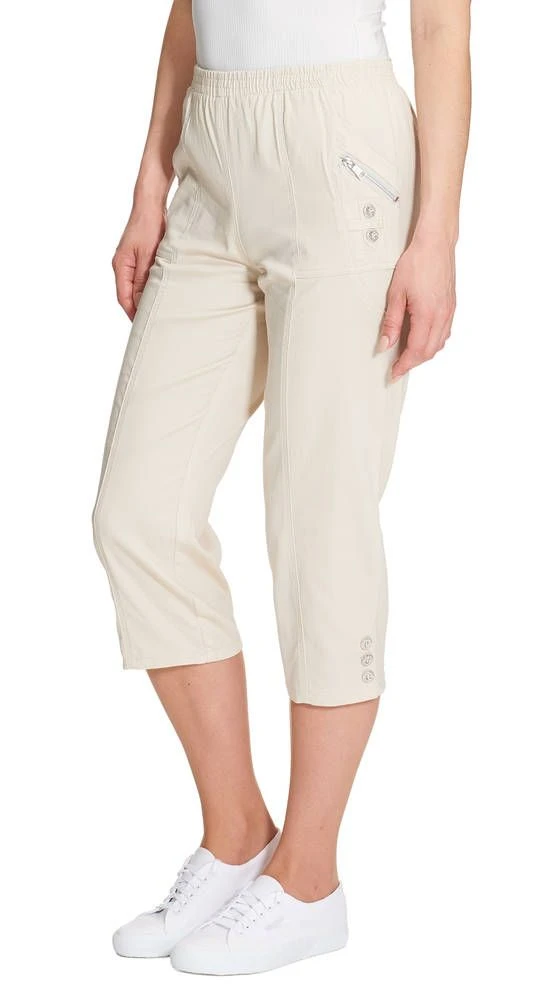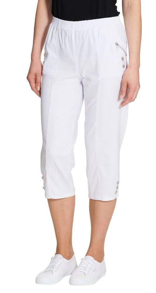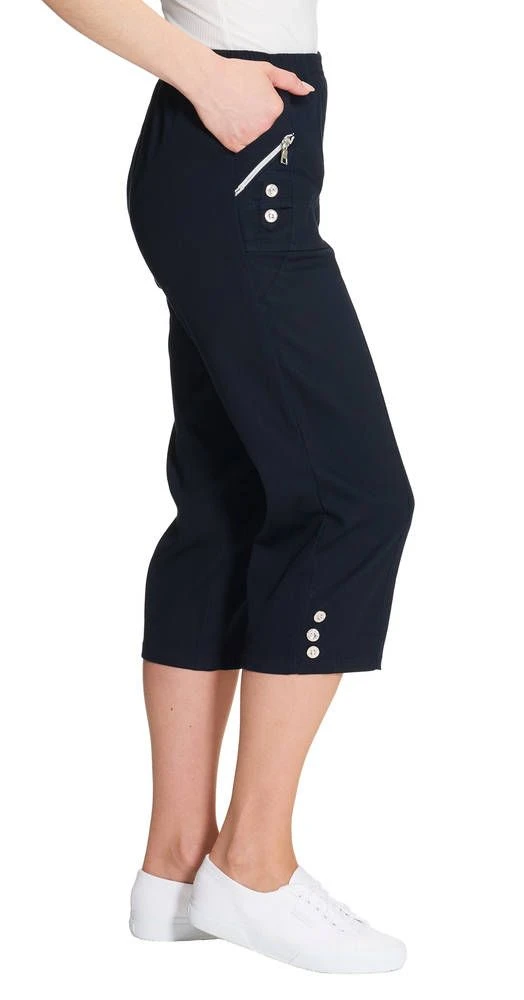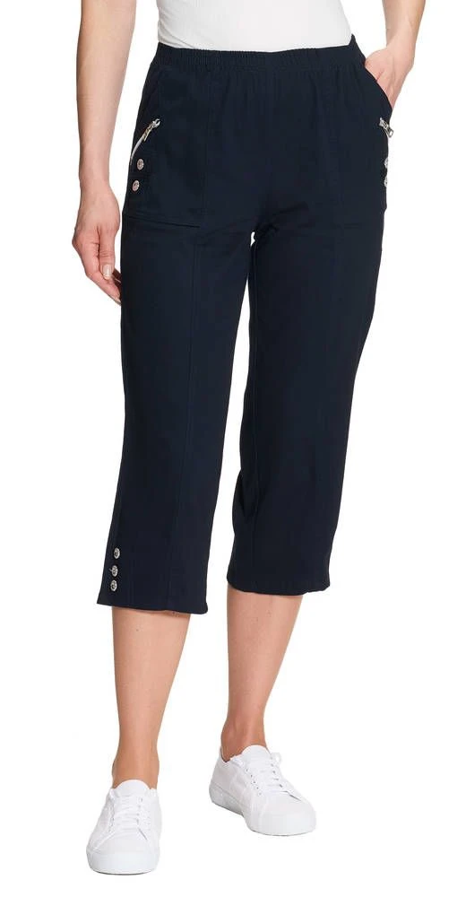 Kuminauhavyötäröiset caprit, jotka joustavuutensa ansiosta ovat erittäin mukavat jalassa. Housuissa on tyylikkäät metalliset vetoketjut sekä nappisomisteet.