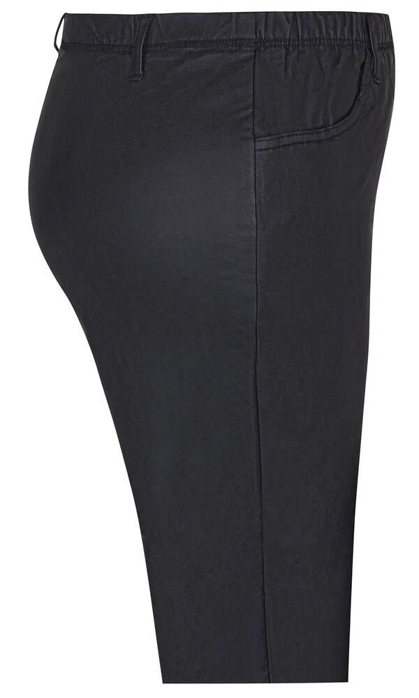 Naisten housut joustavalla vyötäröllä. Housuissa on lahkeissa vetoketjut.